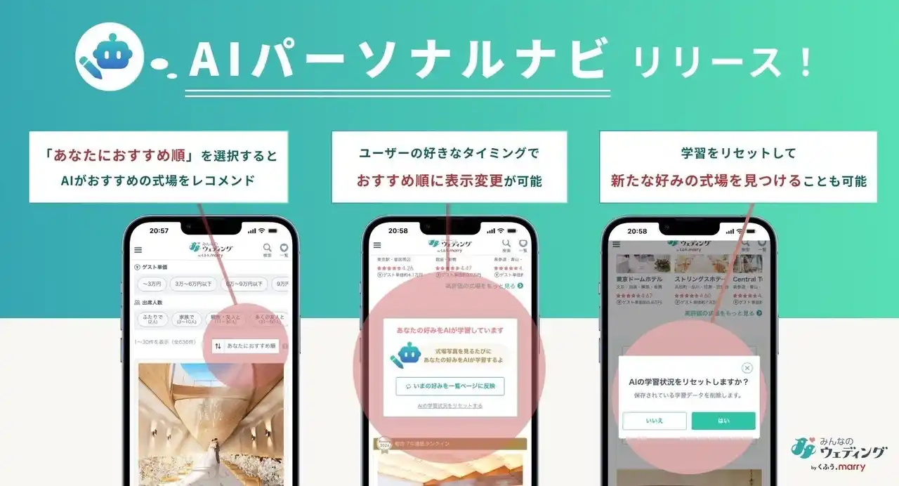 株式会社くふうウェディング(本社:東京都中央区、代表取締役社長:貝瀬 雄一、以下「くふうウェディング」)は、運営するウェディング総合情報サイト「みんなのウェディング」において、AIを活用して提供する情報をユーザーごとにパーソナライズ化する「AIパーソナルナビ」を提供開始いたしました。 |