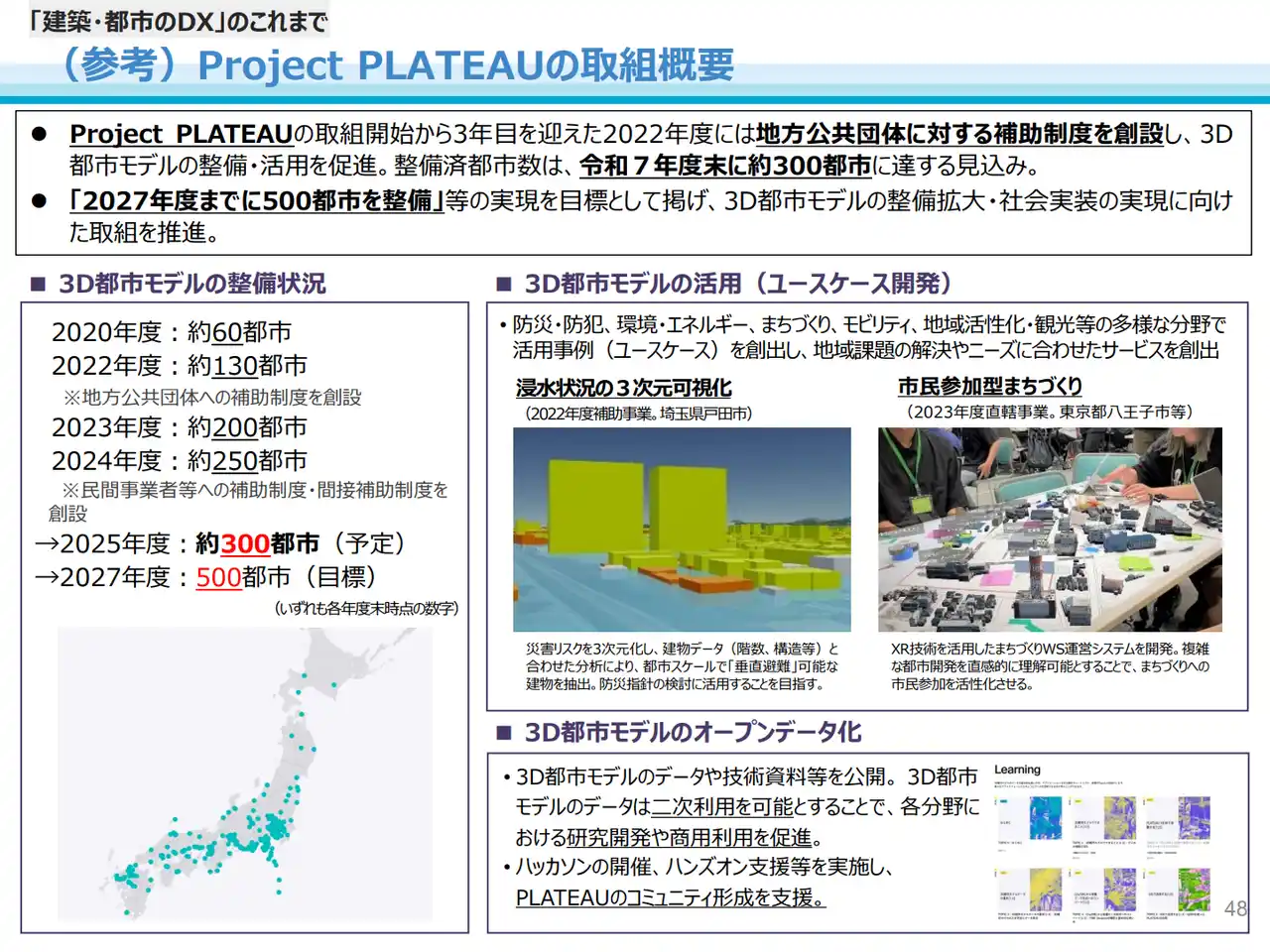 企業や自治体におけるXR・メタバース活用は、実証段階から実装段階へと進みつつあります。国土交通省は2026年3月公表の中長期ビジョンにおいて、デジタルツインを一過性のDXではなく、現実と連動し、継続的に使われる「日常業務等の基盤」として定着させていく必要性を示しています。Project PLATEAUにおいても、3D都市モデルの整備済都市数は2025年度末約300都市を予定し、2027年度には500都市を目標としています。 |