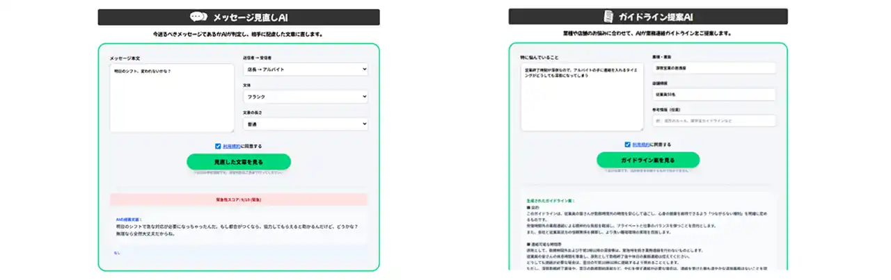 店舗管理者・アルバイト従業員双方が利用可能です。送信者の立場を選択し、伝えたいメッセージ内容を入力するだけで、AIが相手への配慮とビジネスマナーを兼ね備えた適切な文章を生成します。 |