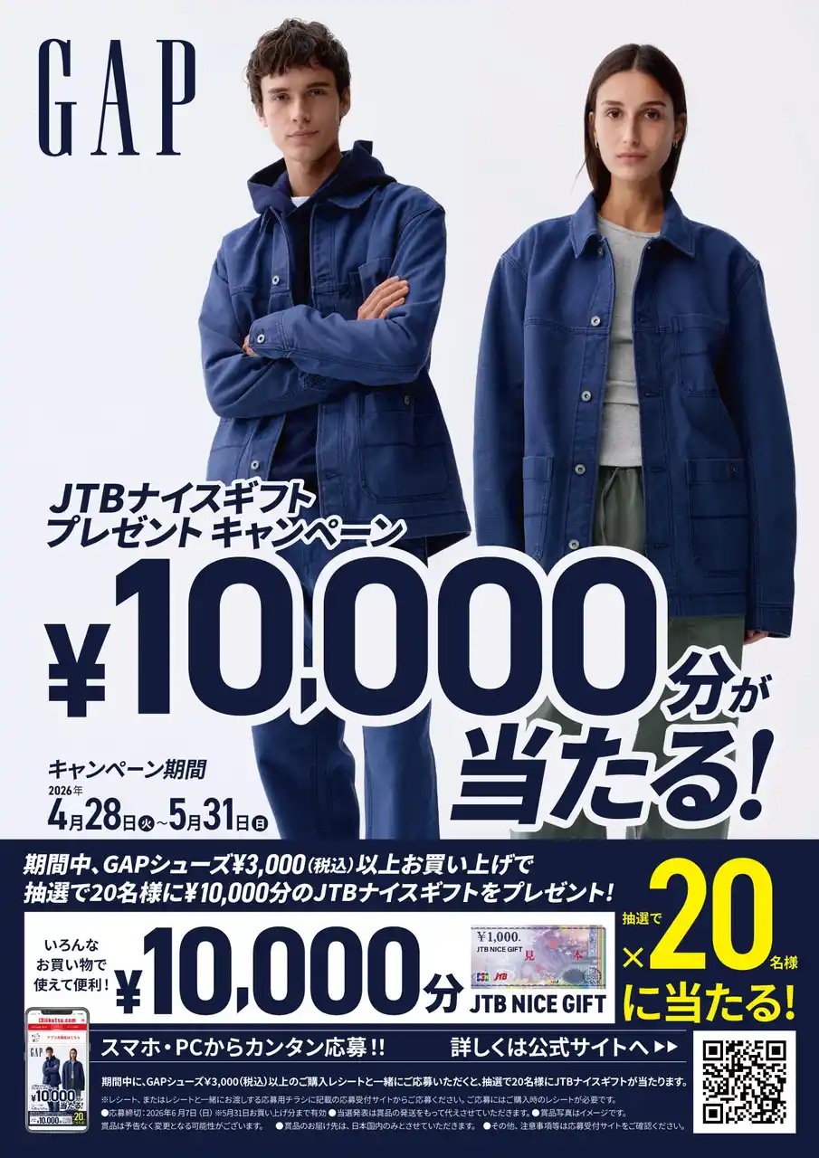 株式会社チヨダ(東京都杉並区 代表取締役社長 町野 雅俊)は、4月28日(火)より、全国のシュープラザ、東京靴流通センター他各店舗と、公式オンラインショップ「kutsu.com」にて、GAPシューズをご購入いただいた方を対象に、抽選でJTBナイスギフトが当たる「GAP JTBナイスギフト プレゼントキャンペーン」を開催いたします。 |