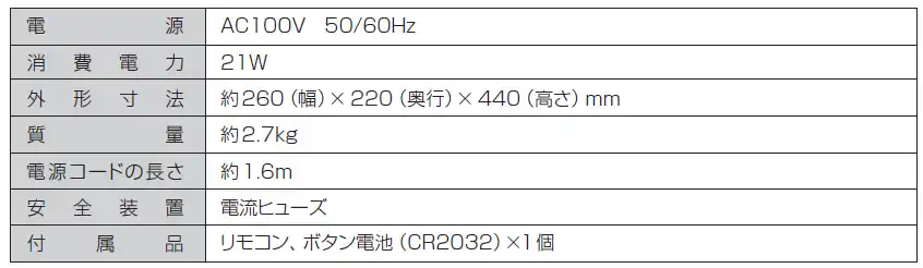 | ・8段階の豊富な風量調節。左右自動首振り約60°、上下自動首振り上約60°、下約15°。 | |||||||||