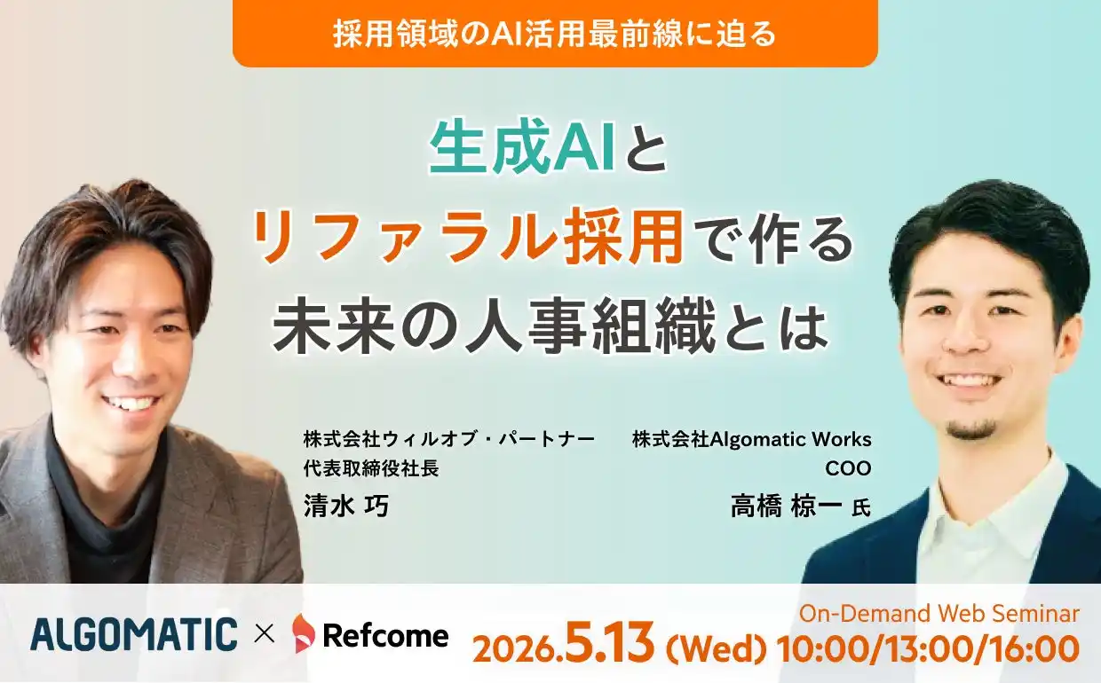ウィルグループのリファラル採用を活性化させるクラウドサービス「Refcome(リフカム)」を提供する株式会社ウィルオブ・パートナー(本社:東京都新宿区、代表取締役社長:清水 巧)は、無料オンラインセミナー「採用領域のAI活用最前線に迫る―生成AIとリファラル採用で作る未来の人事組織とは?【アーカイブ配信】」を2026年5月13日(水)に開催します。 |