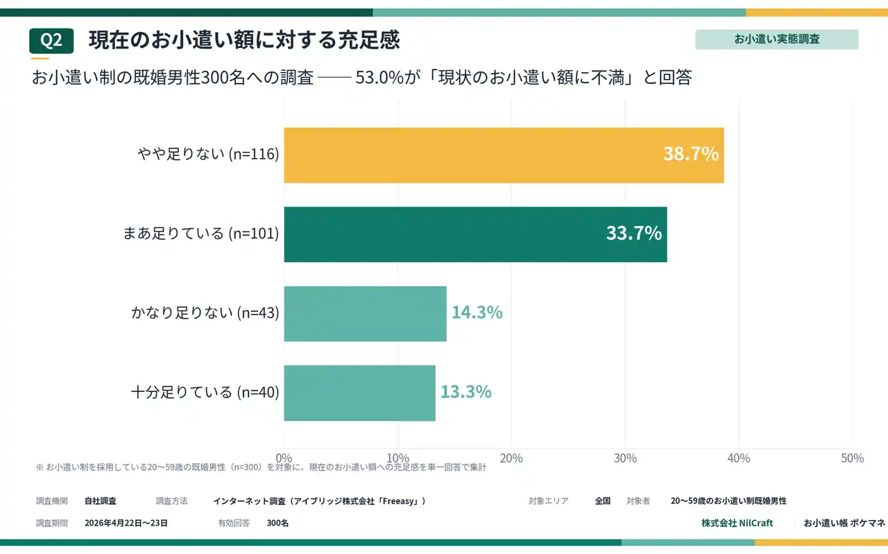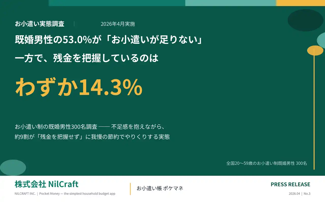 そこで、家計管理アプリ「お小遣い帳 ポケマネ」を開発・運営する株式会社NilCraft( https://nilcraft.jp/ )は、お小遣い制を採用している既婚男性の「お財布事情」を明らかにするため、全国の20歳~59歳の既婚男性300名を対象にインターネット調査を実施しました。 |