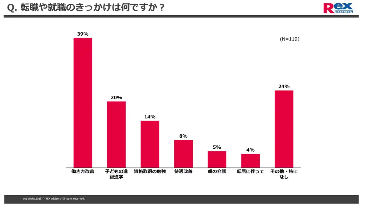 転職や就職のきっかけについて聞いたところ、39%が「働き方改善」を挙げており、パートやアルバイトであっても、働き方改善のニーズが高いことがわかります。またその他・特になしを選んだ方も全体の1/4ほどおり、インターネット検索などをしていてたまたま求人が目に入ったというケースも一定ありそうです。 |