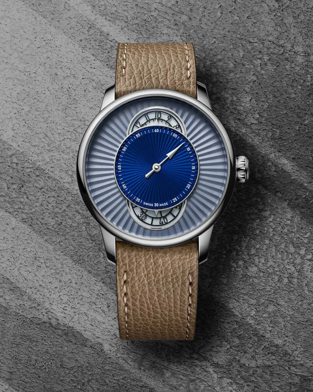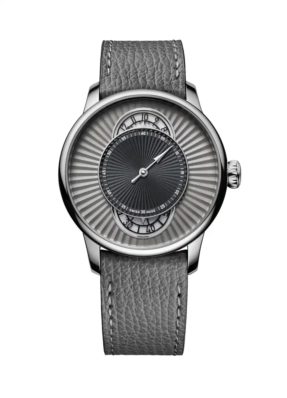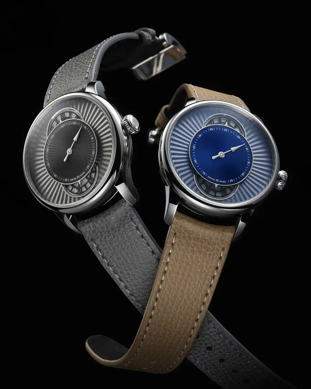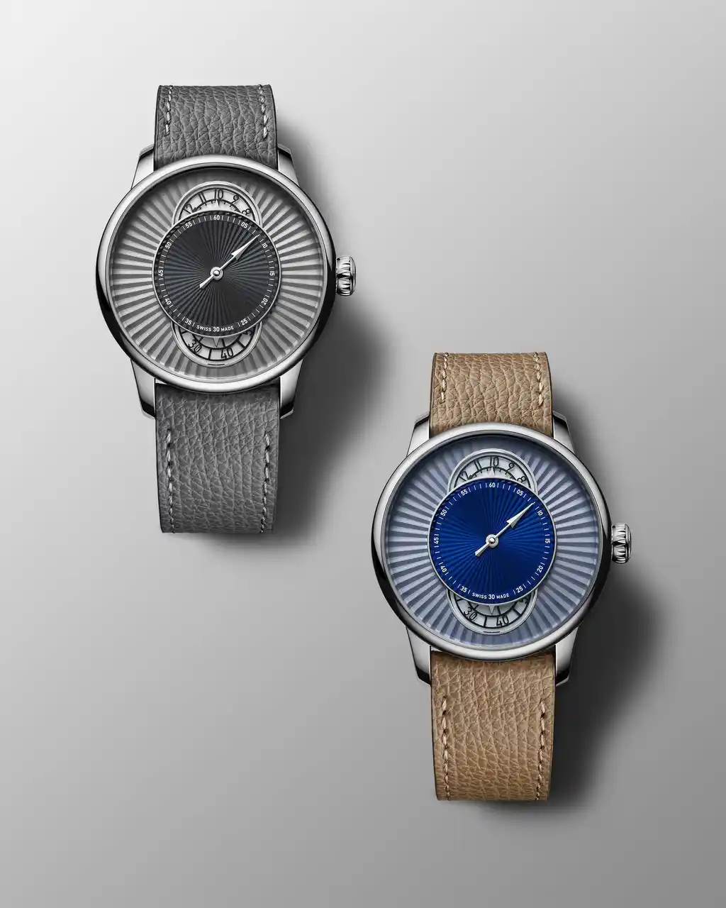両モデルとも、直径39mmのポリッシュ仕上げステンレススティールケースを採用。ブルーモデルにはベージュのカーフストラップを組み合わせ、温かみのある印象を演出。一方、グレーモデルはダイアルからストラップまでトーンを統一し、建築的でミニマルなモノクローム表現を完成させています。現代的なスタイルとクラシカルな時計製造の双方に調和する、控えめで洗練されたトーナルウォッチの潮流を体現しています。 |
