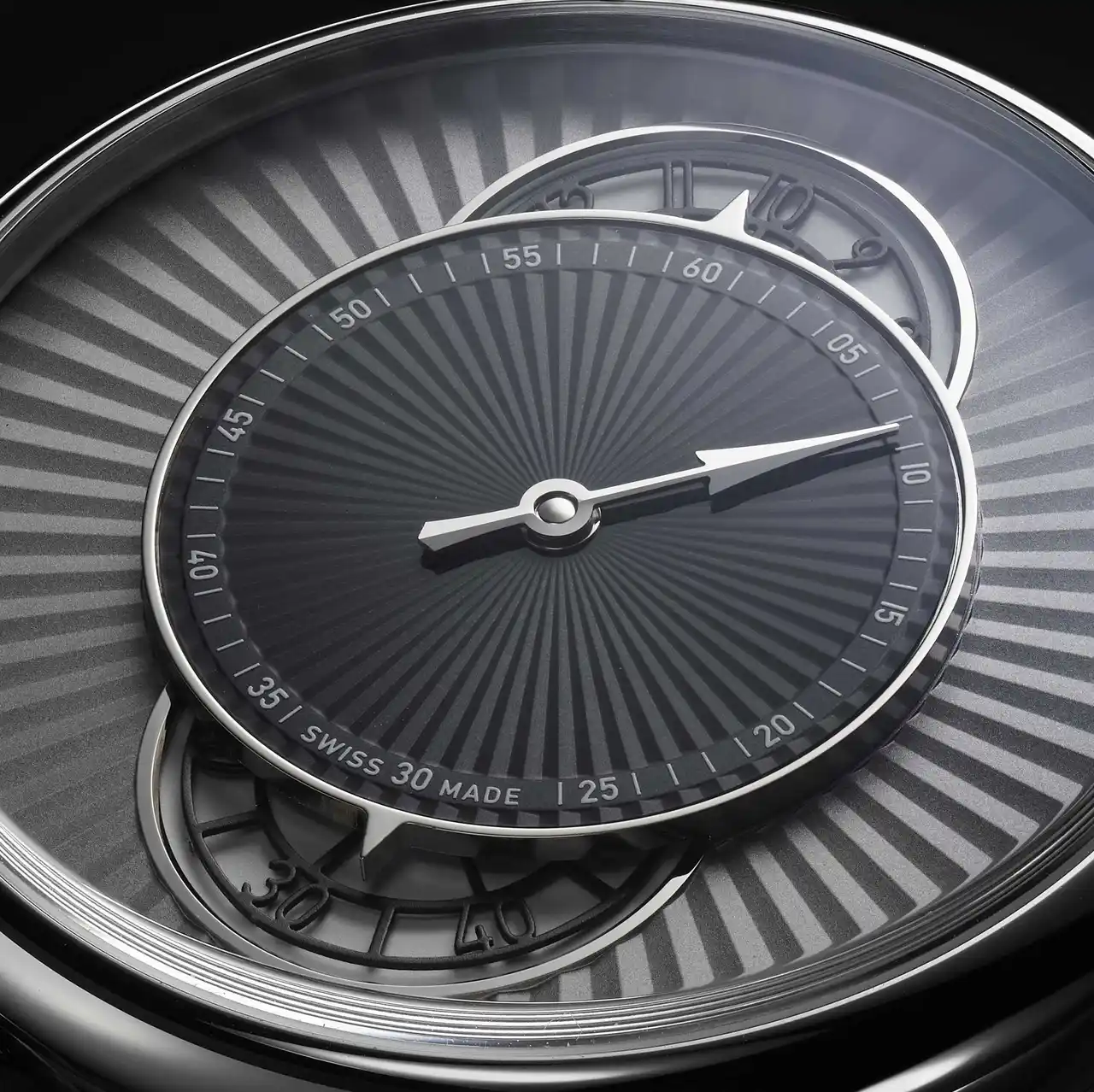 フランケ装飾(波状の模様を重ねる技法)をイメージさせるフルーティッドサンレイ仕様の文字盤ベースと浮遊感のある各ディスクは新しいメティエダールの表現 |