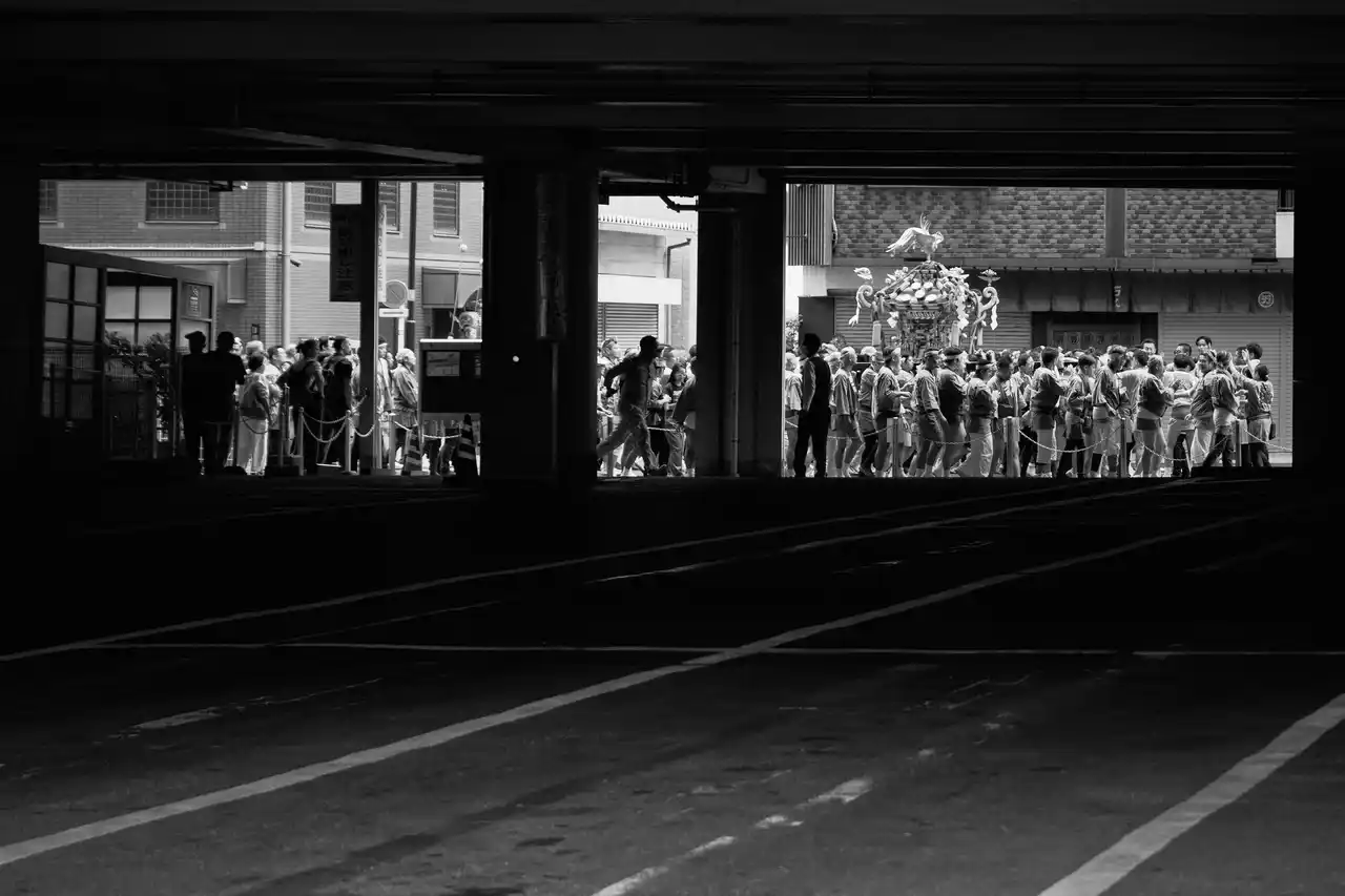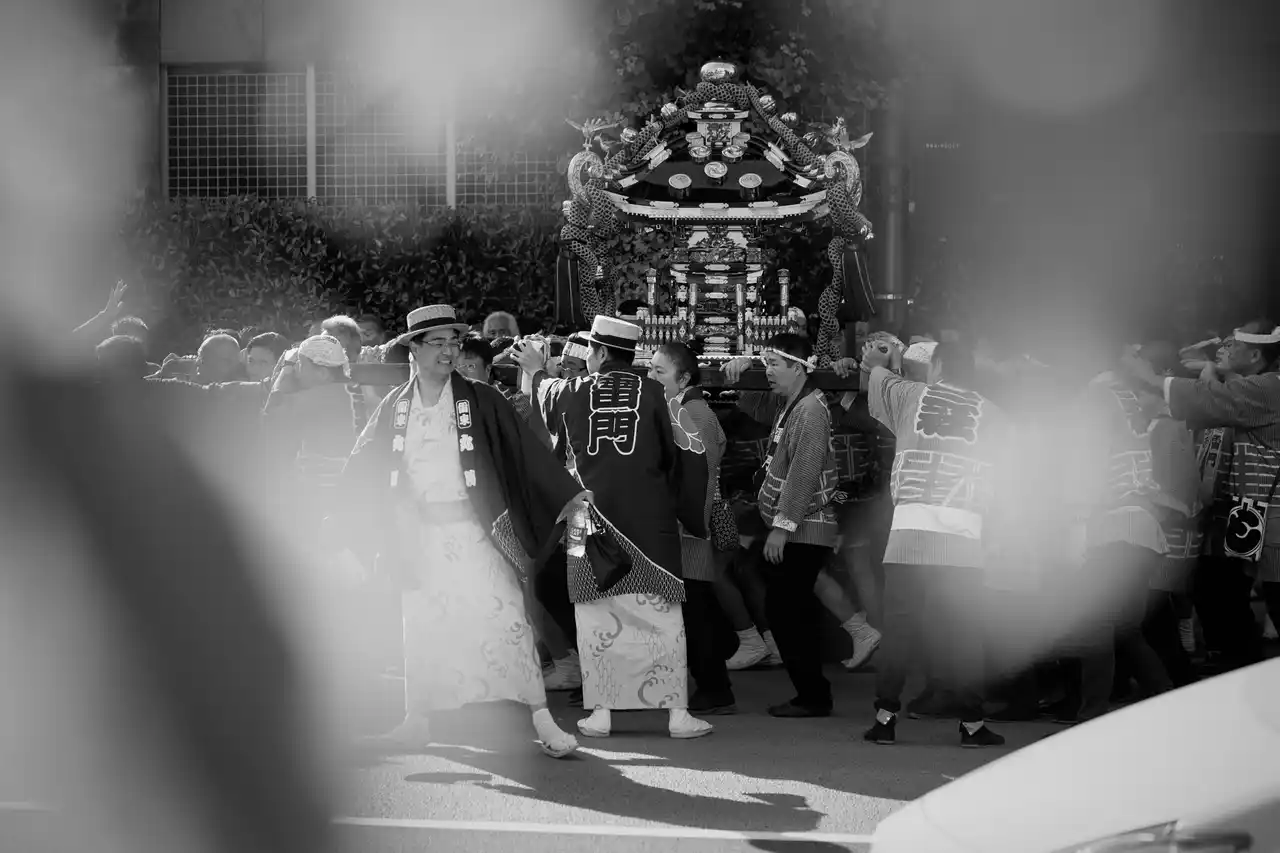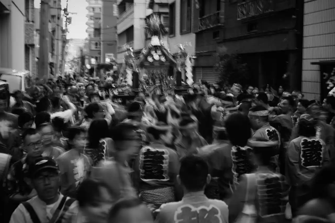 写真学校時代に課題としてこの祭りを知り、あの頃と同じ場所に立ち、再びファインダーを覗くと、祭りに集う人々の熱気や力強さは何ひとつ変わっていないことに気づきました。強い日差しの中で、汗を流しながら神輿を担ぐ人々の姿は、今も昔も変わらず、この街に生きるエネルギーそのものだと思います。 |