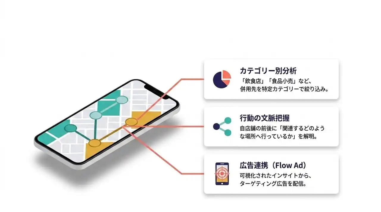 Location AI株式会社(本社:東京都渋谷区、代表取締役:小尾一介)は、自社開発のクラウド型人流データ活用プラットフォーム「Location AI Platform(R)(LAP)」において、特定の場所を訪れた人の来訪前後の行動を、飲食、食品、小売、ドラッグストアなどの施設カテゴリ単位で分析・可視化し、広告配信まで連携できる新機能を発表いたしました。これにより、従来のような「特定の場所に来訪した」という点での捉え方にとどまらず、来訪前後に「どの施設カテゴリを併用しているか」という行動文脈に基づいた分析が可能になります。さらに、可視化された「潜在的な興味・関心」を広告配信に活用することで、自店舗来訪者に加え、関連性の高い行動傾向を持つ層にもアプローチできるようになります。