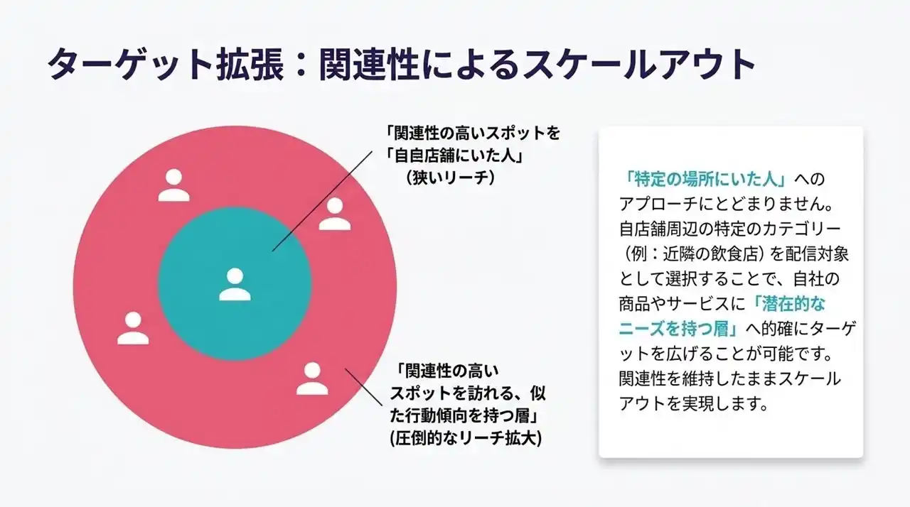 関連施設カテゴリの来訪者へ配信対象を拡張した人流広告 |
