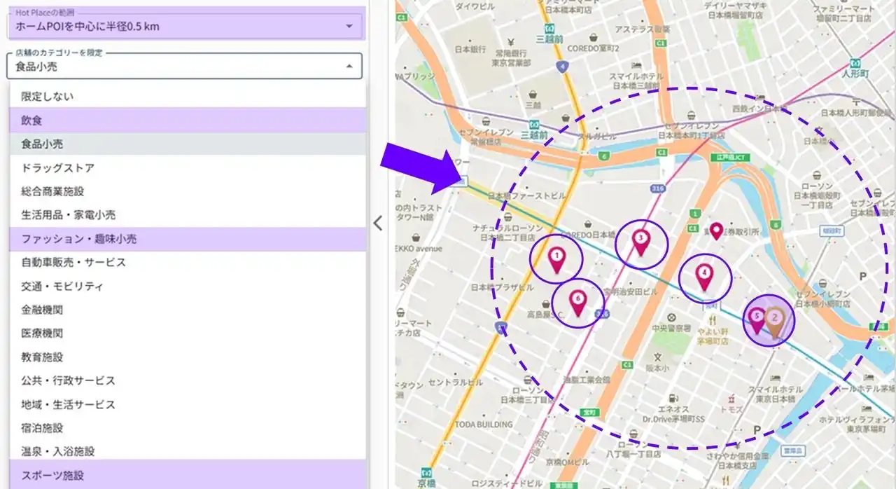 今回のアップデートにより、新たにホームPOIを中心に半径5km以内などの範囲で、「飲食」や「スポーツ施設」といった施設カテゴリ単位での分析が可能になりました。 |