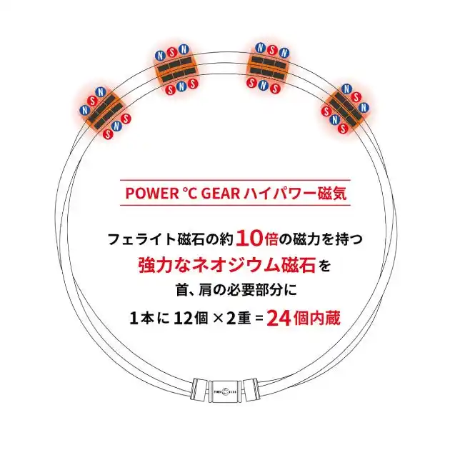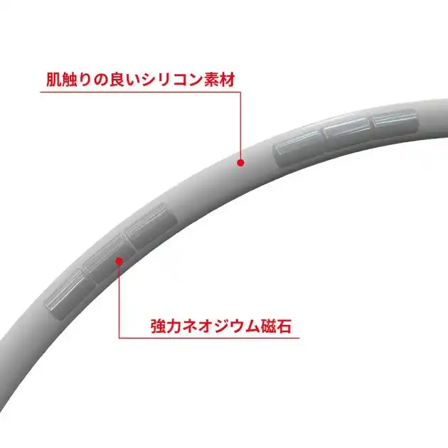 強力なネオジウム磁石をループ内部には、 磁束密度160 mT のネオジウム磁石を1本に12 個 ( 2本で24個 ) 内蔵。2重ループ構造によって誕生した、他にはない次世代の磁気疲労回復ネックレス。 |