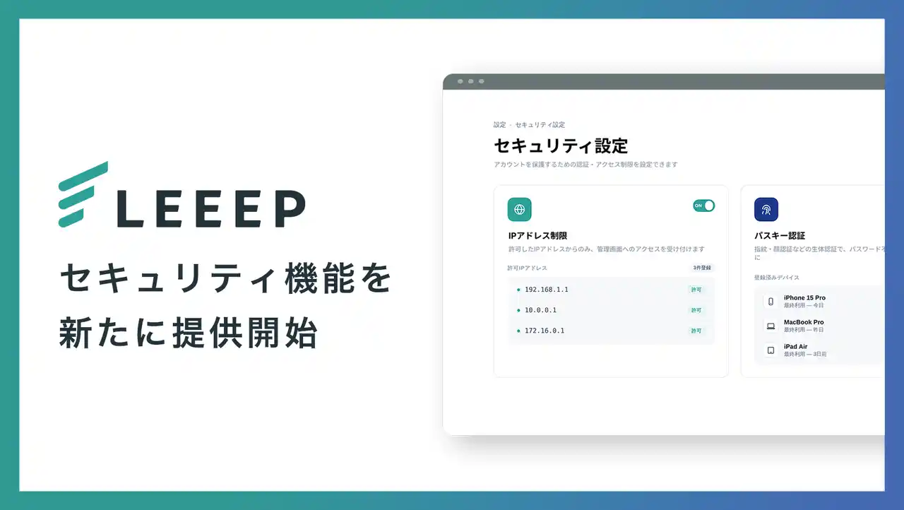 | 株式会社REGALI(本社:東京都渋谷区、代表取締役社長:稲田光一郎)が提供する、顧客体験向上プラットフォーム「LEEEP(リープ)」は、LEEEPの管理画面にログインする際のセキュリティを強化する2つの新機能「パスキーログイン」および「アクセス元IPアドレスによるログイン制限」を新たにリリースいたしました。 | |||