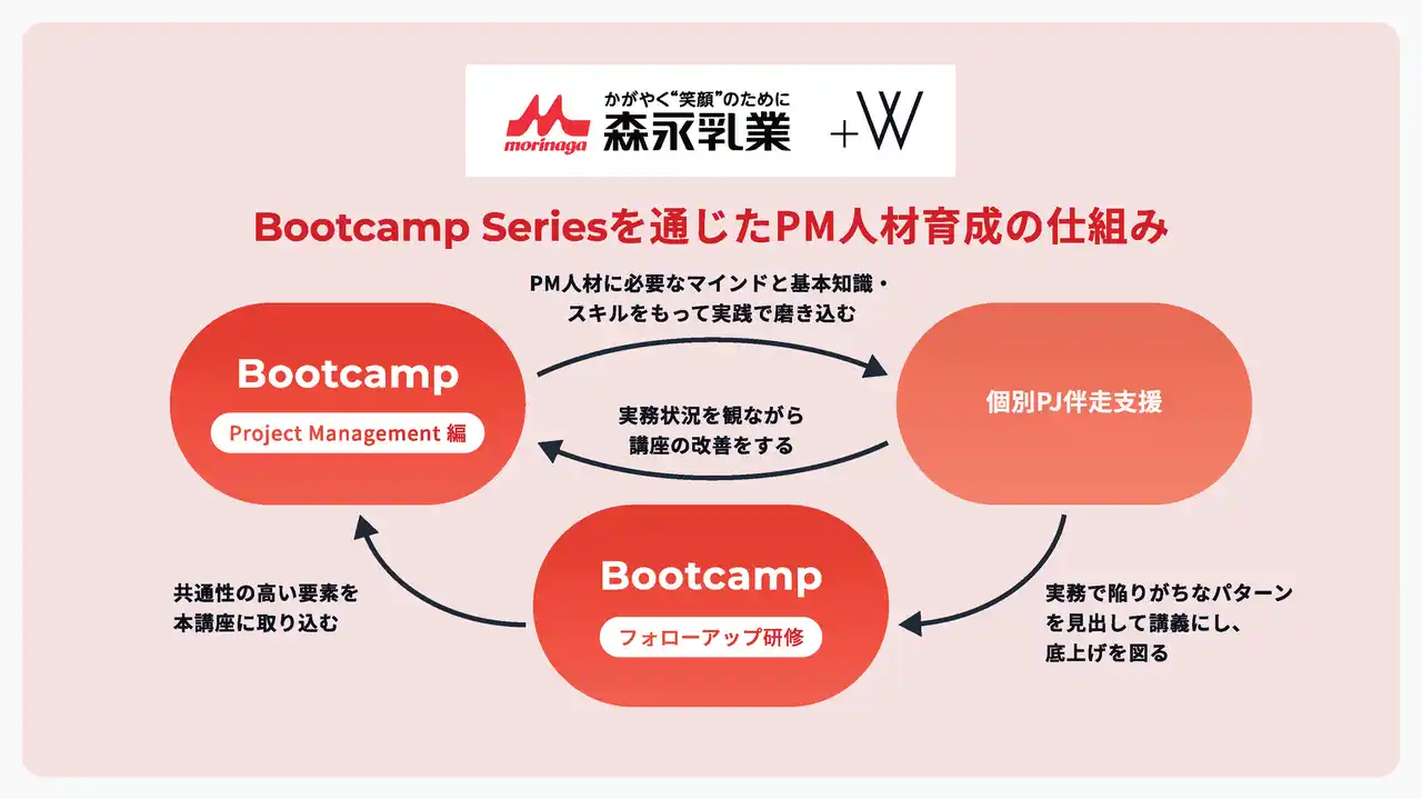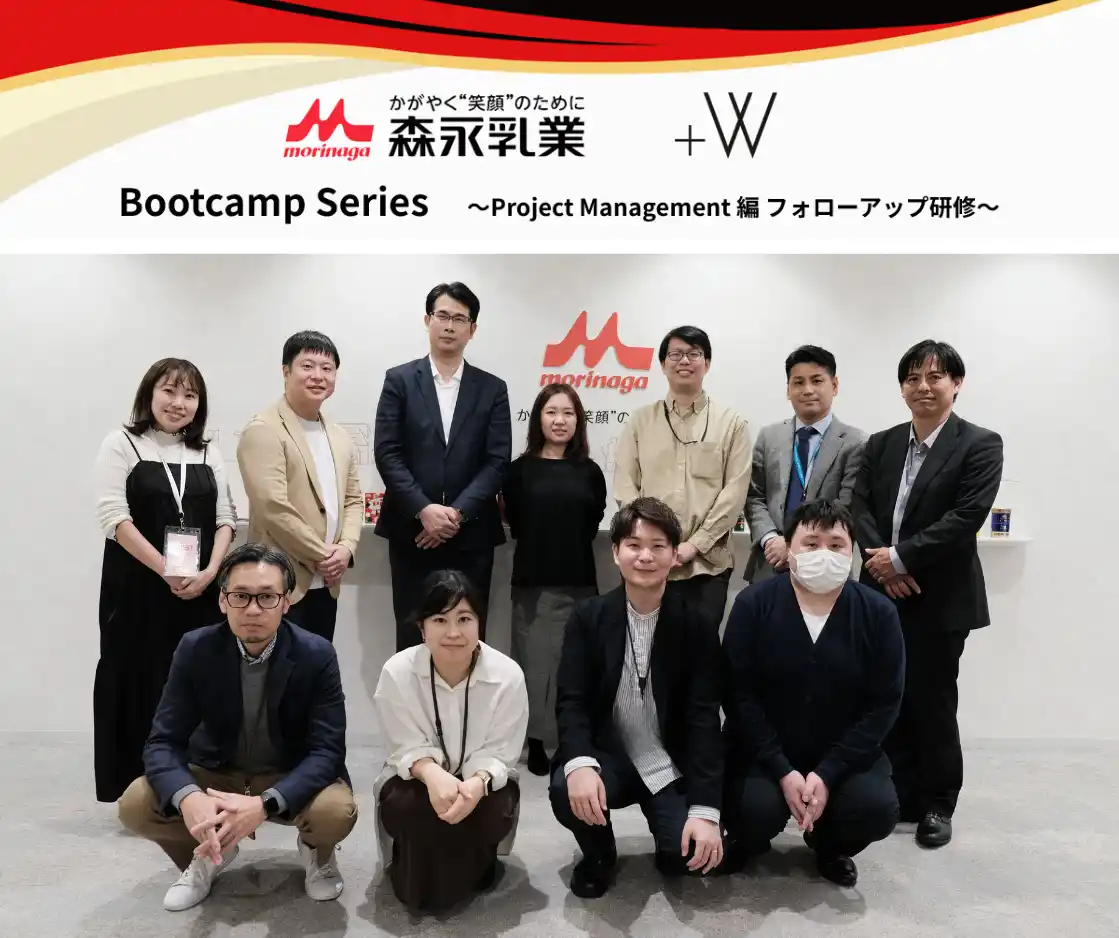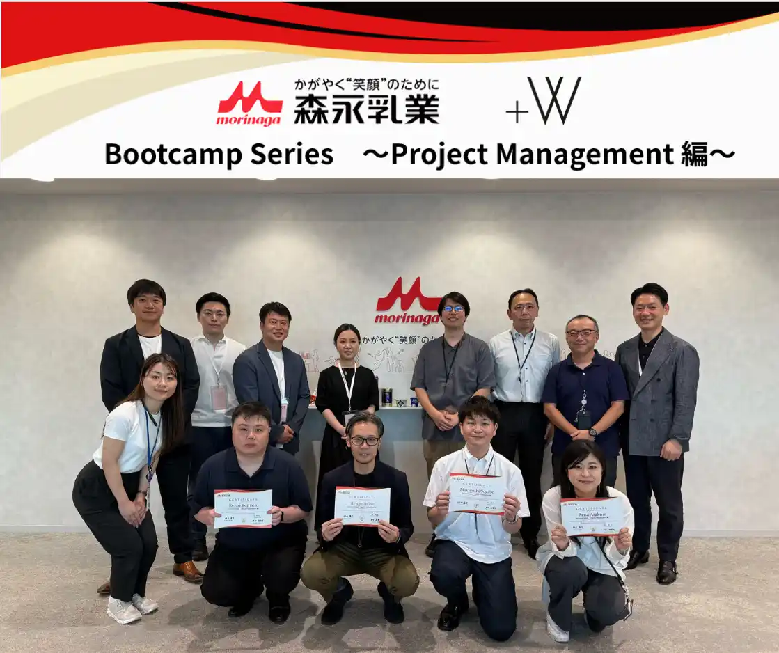 Plus W株式会社(本社:東京都渋谷区、代表取締役社長:櫻井 稚子、以下「Plus W」)は、森永乳業株式会社(本社:東京都港区、代表取締役社長:大貫 陽一、以下「森永乳業」)の「森永乳業グループ10年ビジョン」達成におけるDX人材育成の重要性を踏まえ、プロジェクトマネジメント人材(以下、「PM人材」)の育成が急務と考え、当社が伴走体制のもと、森永乳業の実プロジェクトを題材にした、テーラーメイドの実践型PM人材育成プログラム「Bootcamp Series ~Project Management 編~」を実施いたしました。また、2026年4月より第2期も開始し、カリキュラムの拡充、DX経験の有無を問わず参加し、成果創出に繋げるプログラムへの発展に挑戦します。 |