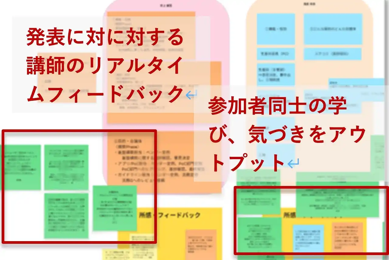 オンラインホワイトボードを活用した宿題やワークのアウトプット、講師による リアルタイムフィードバック、参加者同士の学びをアウトプット(図表参照) |