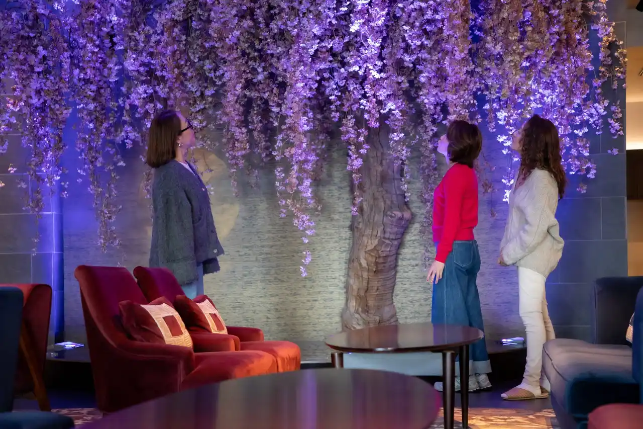 七色に輝く「月下の櫻」が美しい「上諏訪温泉しんゆ」のロビーラウンジ |