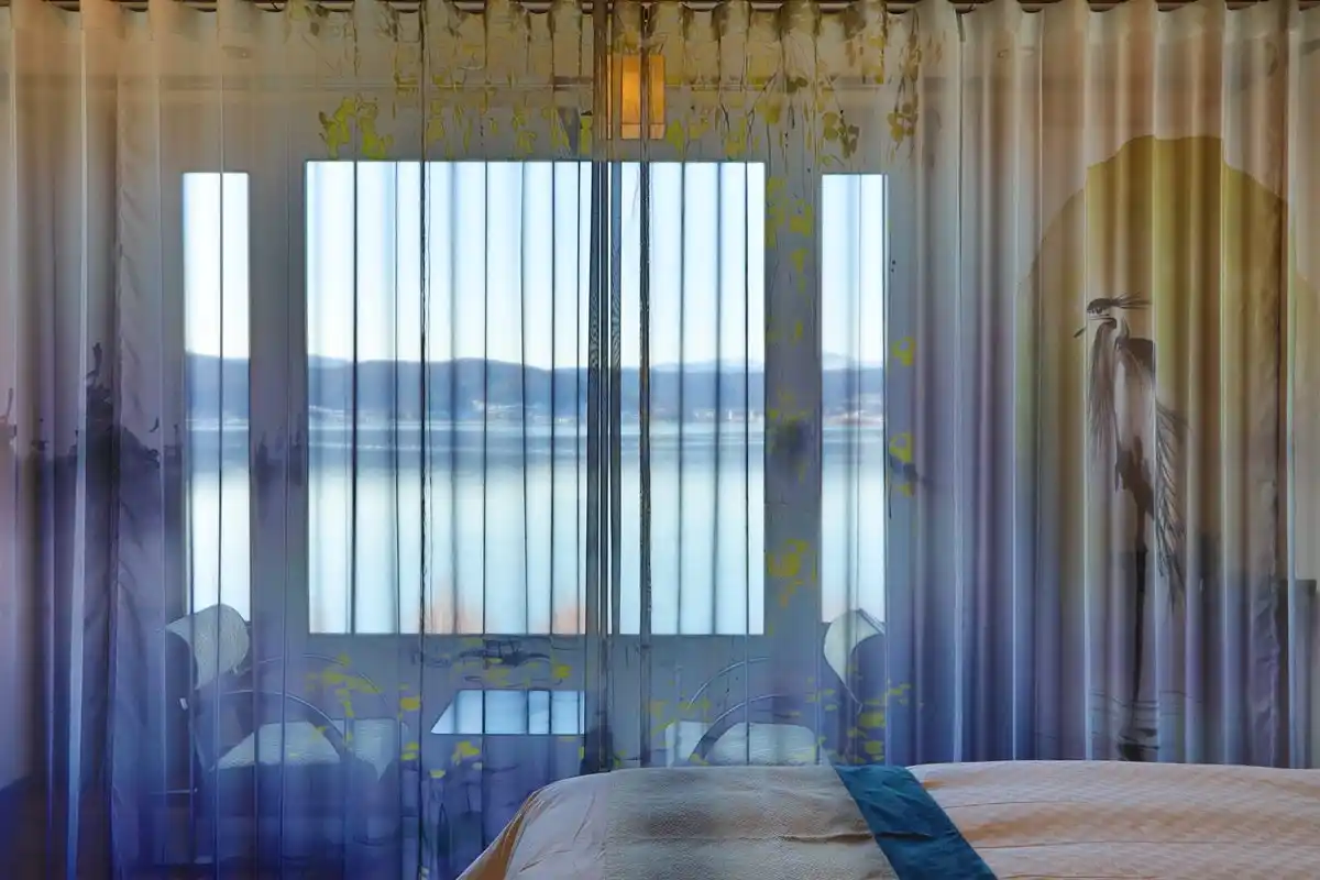 水墨画のレースカーテン越しに見える諏訪湖を絵画のように見立てた客室 |