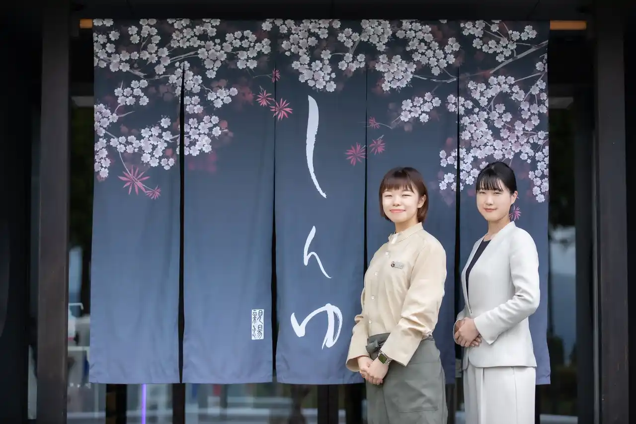 「上諏訪温泉しんゆ」の暖簾とお出迎えをするスタッフ |