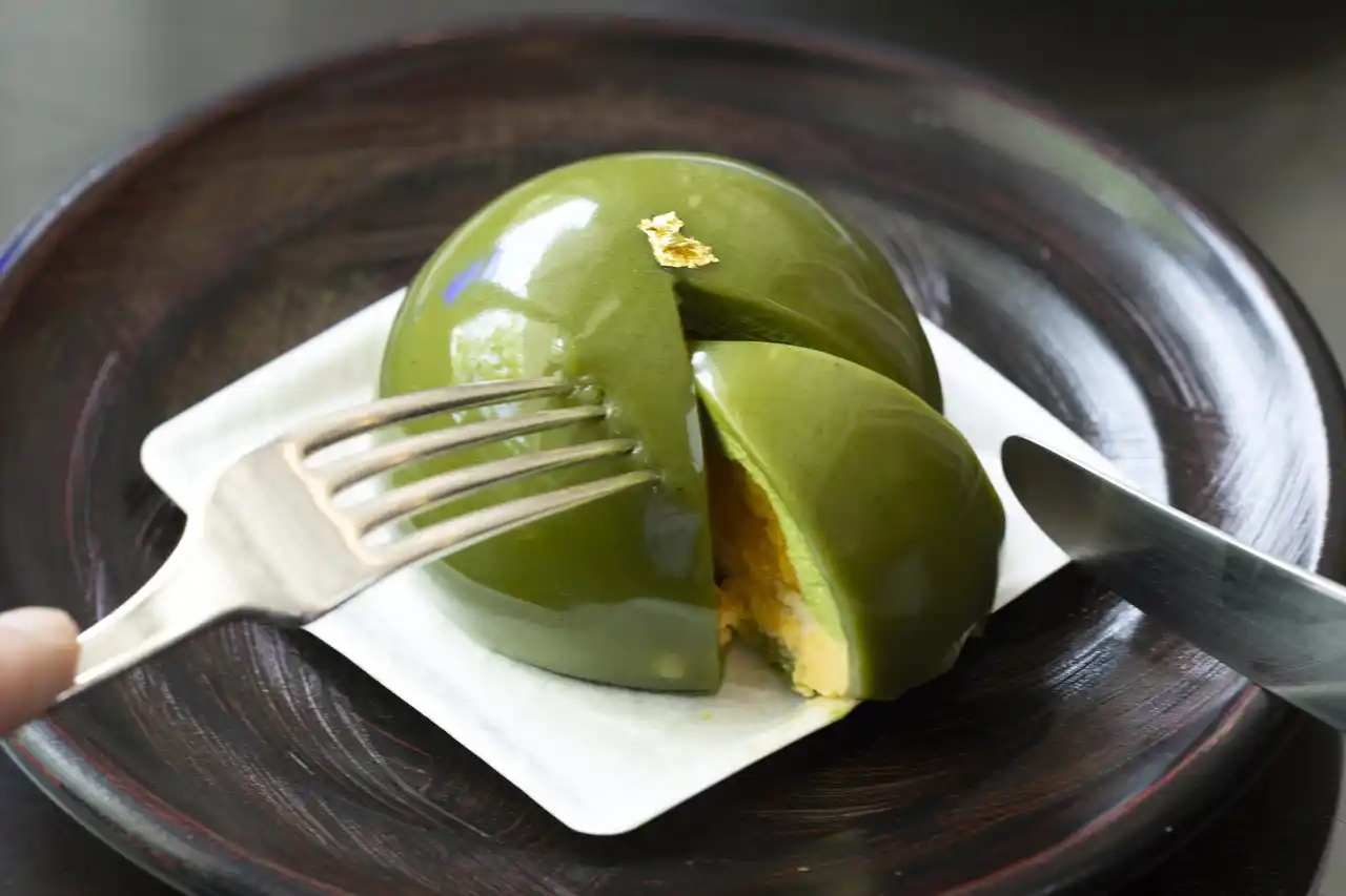 夏季は、爽やかな酸味が特徴のアプリコットのムースを使用し、軽やかな味わいに仕上げました。和三盆のやさしい甘みと香り高い抹茶のほろ苦さを重ねたムースの中に、アプリコットの爽やかな酸味を忍ばせ、外側には抹茶を練り込んだグラサージュをコーティング。一口目から抹茶の豊かな風味をお楽しみいただけます。 |