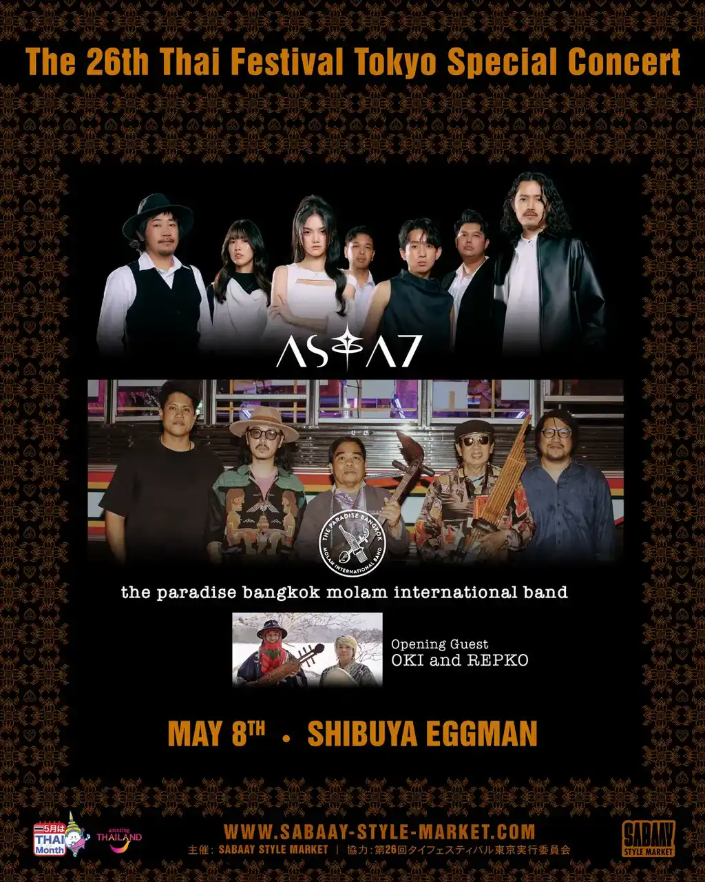 タイの伝統音楽をジャズやポップスと融合させたASIA 7と、世界中のフェスを席巻するモーラム・ユニットThe Paradise Bangkok Molam International Bandが登場。オープニングアクトには、アイヌの伝統弦楽器トンコリ奏者・OKIによるプロジェクト「OKI Rekpo」を迎え、アジアのルーツミュージックが共鳴する歴史的な一夜となります。 |
