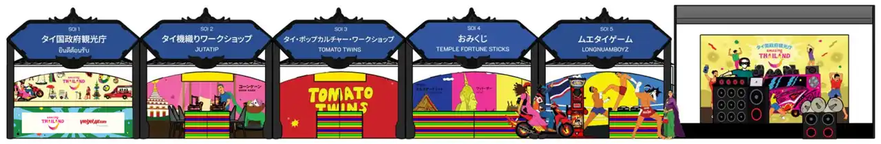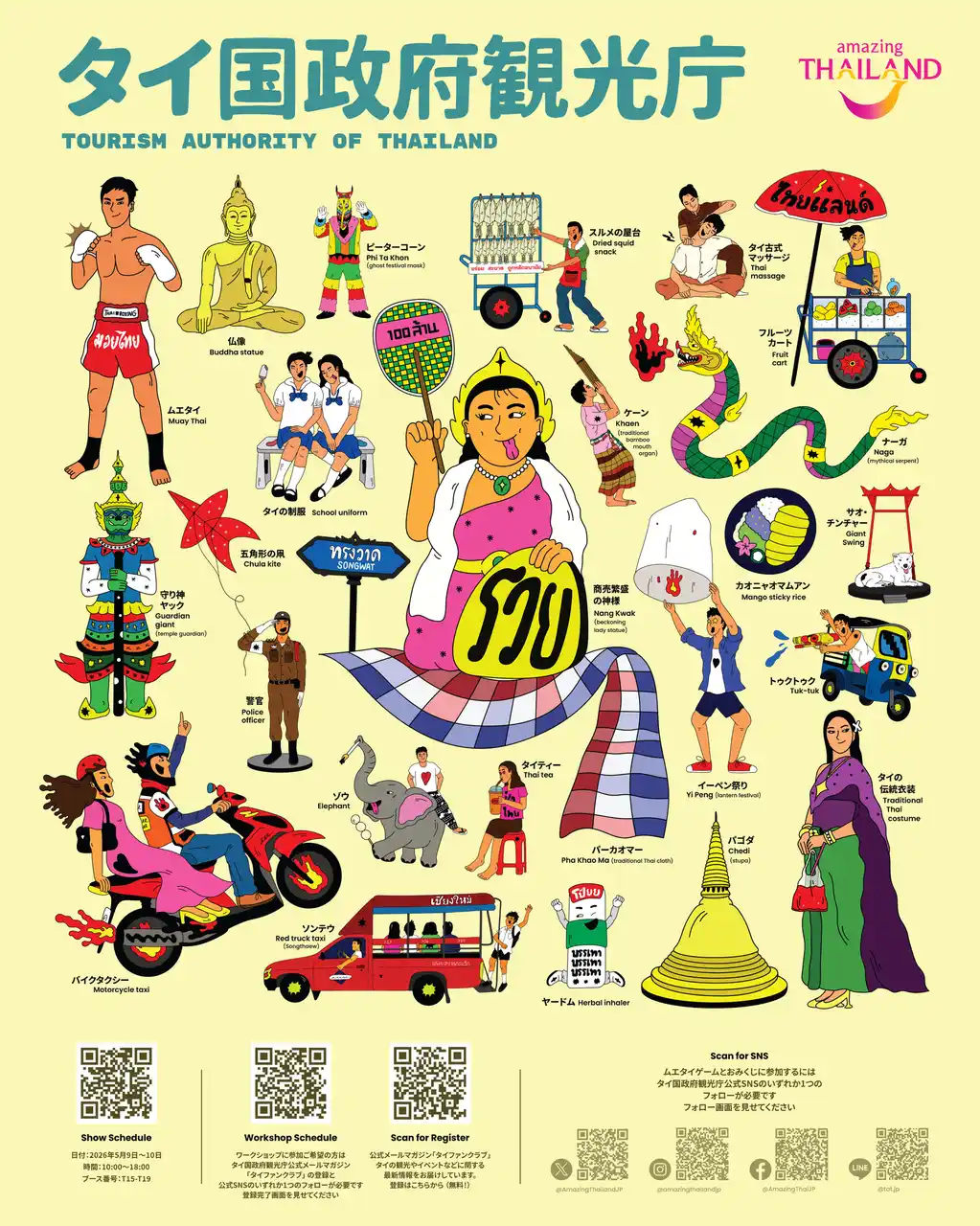 タイ国政府観光庁(TAT)のAmazing Thailandブースでは、タイを「グローバルなポップカルチャーの目的地」として位置づけ、多様な角度からタイカルチャーを紹介します。5ブースの体験型コンテンツをご用意し、実際に「遊び、感じ、体験する」ダイナミックなプレイグラウンドとして、タイの新しい魅力をお届けします。 |