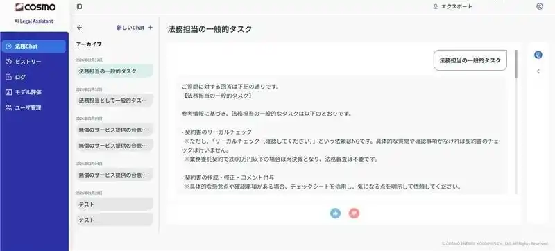 株式会社MILIZE(本社:東京都港区、代表取締役社長:田中 徹、以下「MILIZE」)は、コスモエネルギーホールディングス株式会社(本社:東京都中央区、代表取締役社長:山田 茂、以下「コスモエネルギーホールディングス」)の『AI法務相談ツール』を開発しました。 |