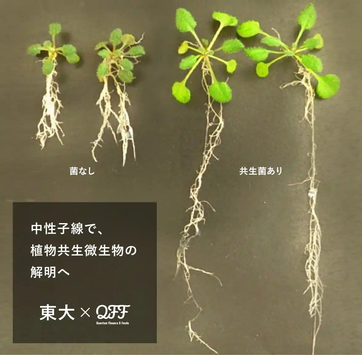 本研究では、QFFが提供する非GMOの変異誘発技術「中性子線スピーディ育種(R)」を活用し、植物共生微生物に多様な遺伝的変異を導入することで、植物成長促進や共生機能に関わる新しい遺伝子・生理機構の解明を目指します。 |