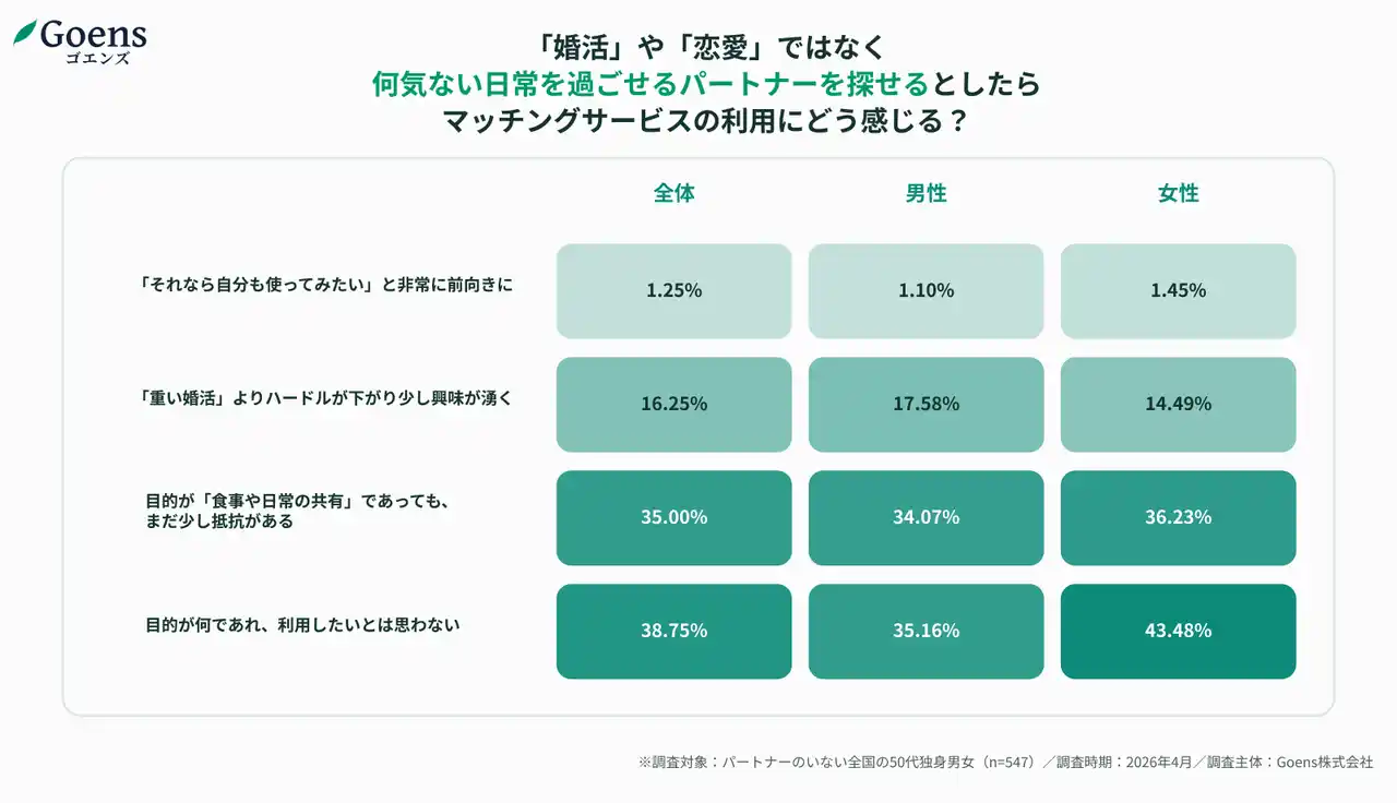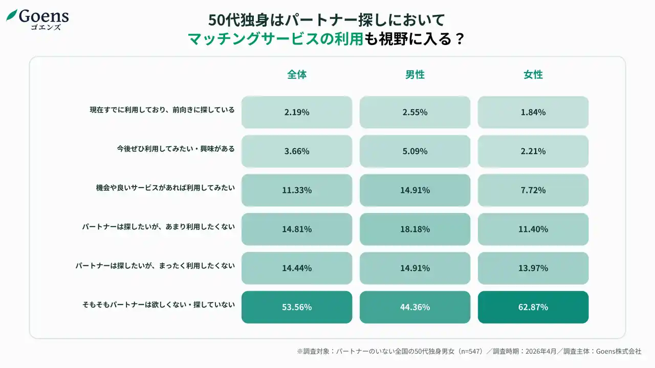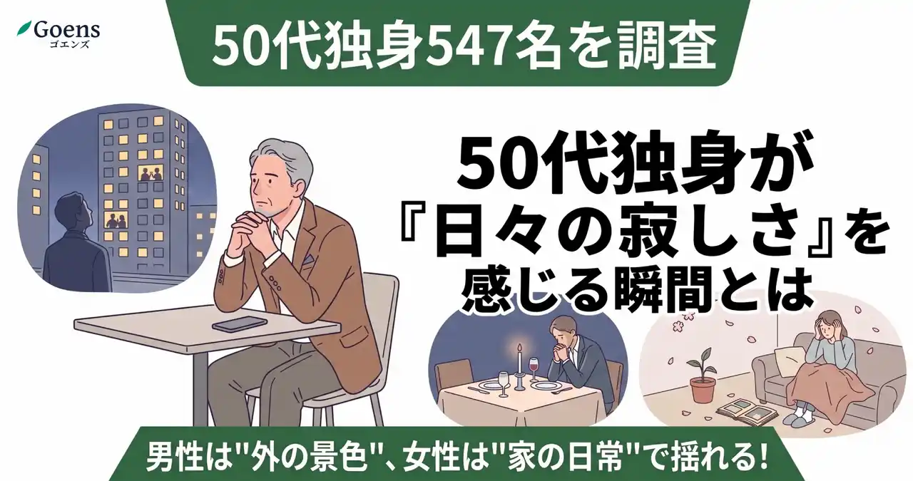 50歳以上限定のマッチングアプリ「Goens(ゴエンズ)」(運営:Goens株式会社/本社:愛知県名古屋市/CEO:廣澤 和也)は、全国のパートナーのいない50代独身男女を対象に、「一人の哀愁」を感じる瞬間と、新しい出会いの場に対する意識について調査を実施しました。 |