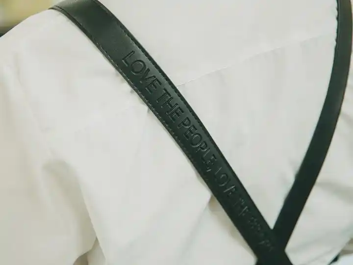 制服の一部には、しなやかで上質な質感を持つ人工皮革素材を採用し、ストラップとして使用しています。 |