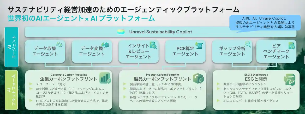 Unravel Carbon 製品群 ─ サステナビリティ業務を一気通貫でカバーするサステナビリティ特化の「エージェンティックプラットフォーム」 |