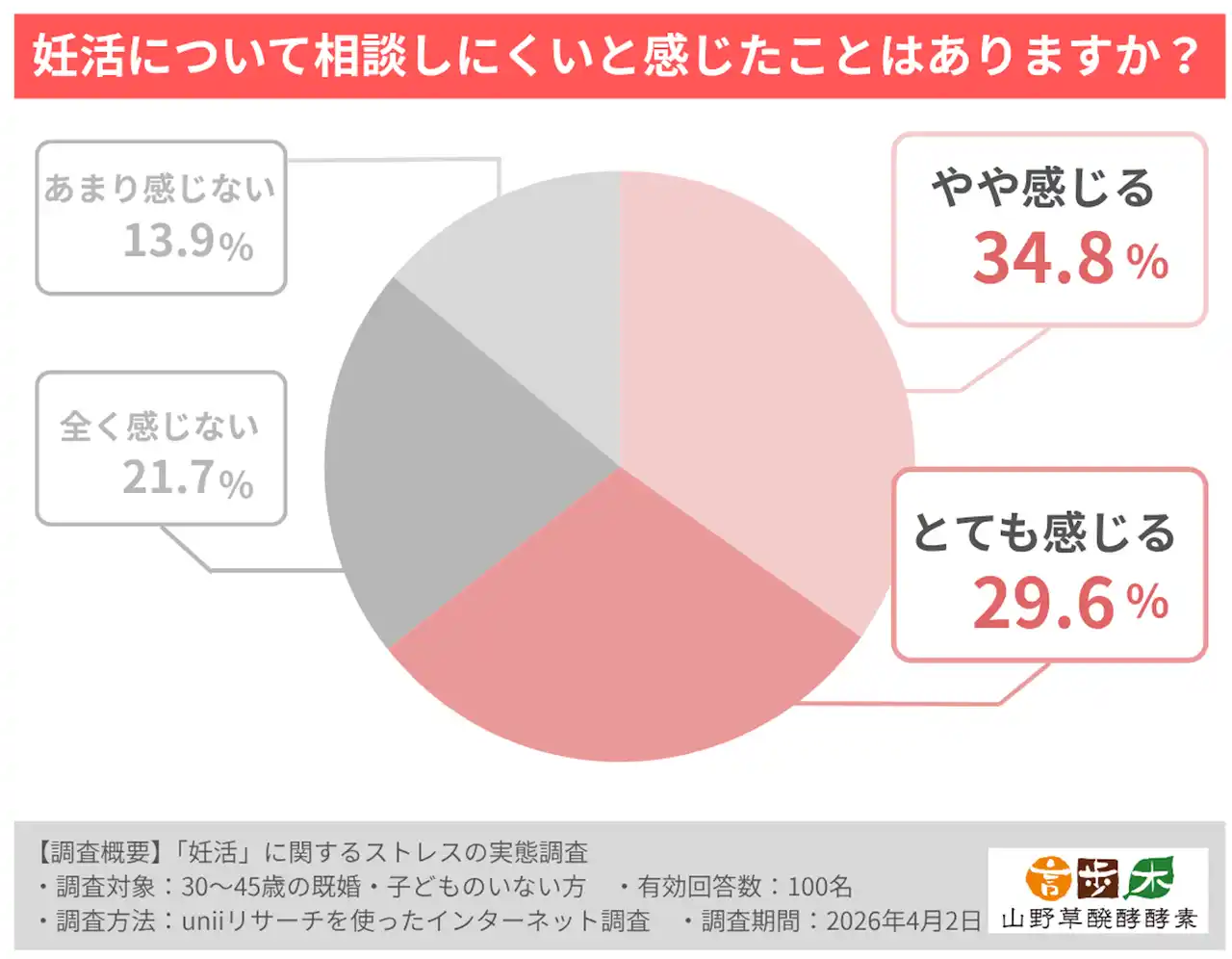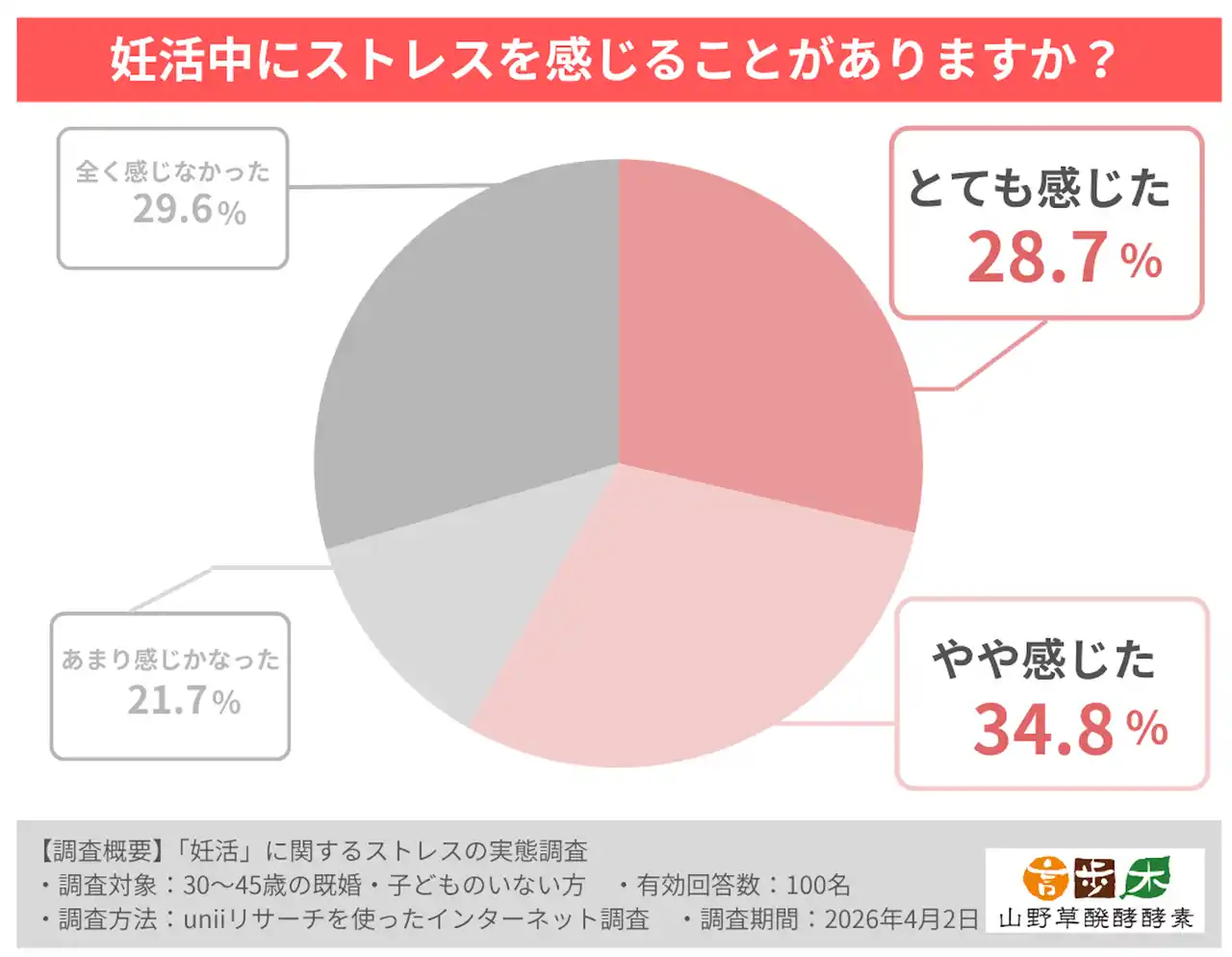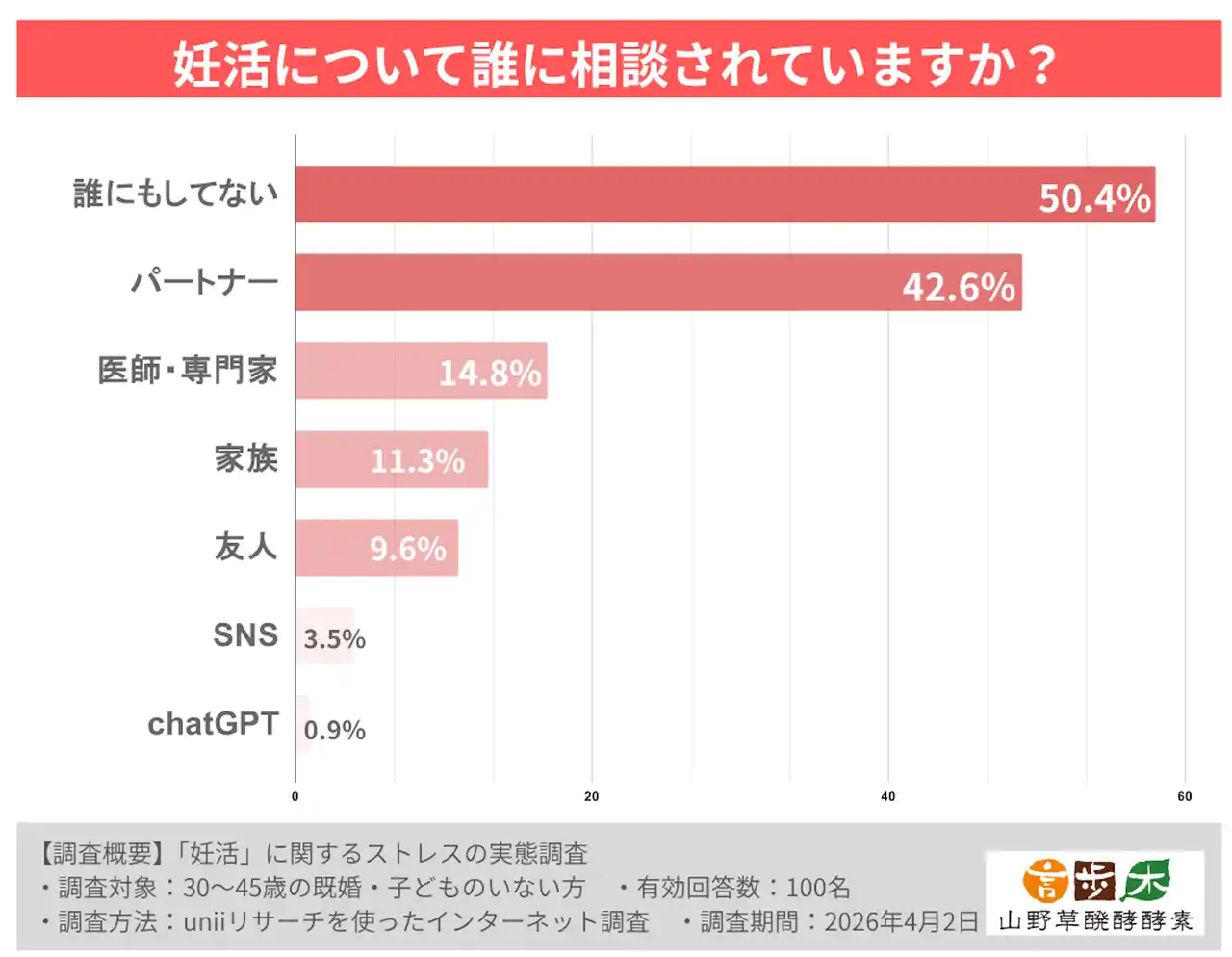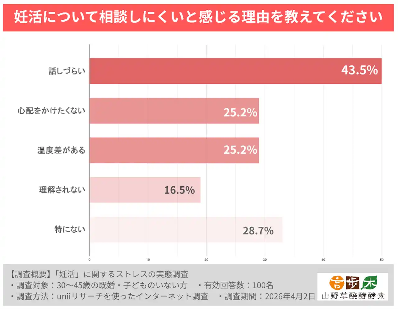 【調査概要】妊活に関するストレスの実態調査 ・調査対象:30~45歳の既婚子どものいない方 ・有効回答数:100名 ・調査方法:uniiリサーチを使ったインターネット調査 ・調査期間:2026年4月2日 |