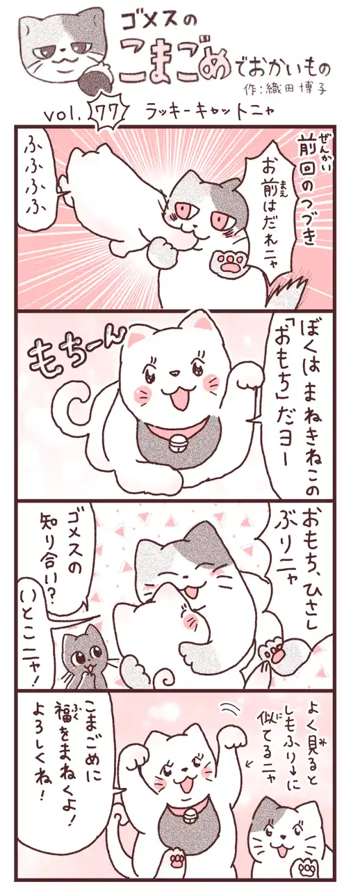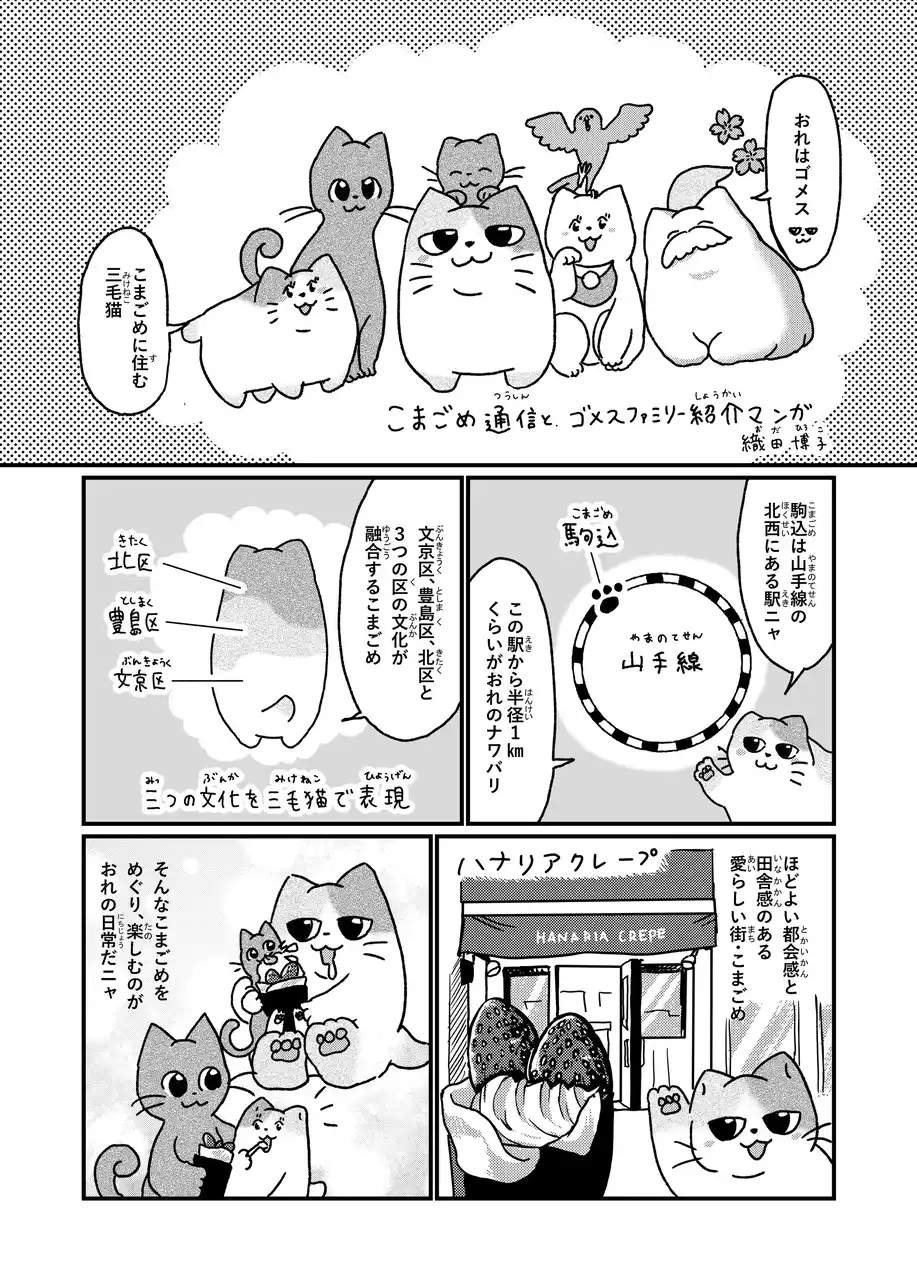 こまごめ地域をパトロールする三毛猫(3つの文化を象徴)こまゴメスは、こまごめ通信のキャラクターでもあり、最近ではこまごめ地域の人々に認知され、愛されるキャラクターに成長しています。 |