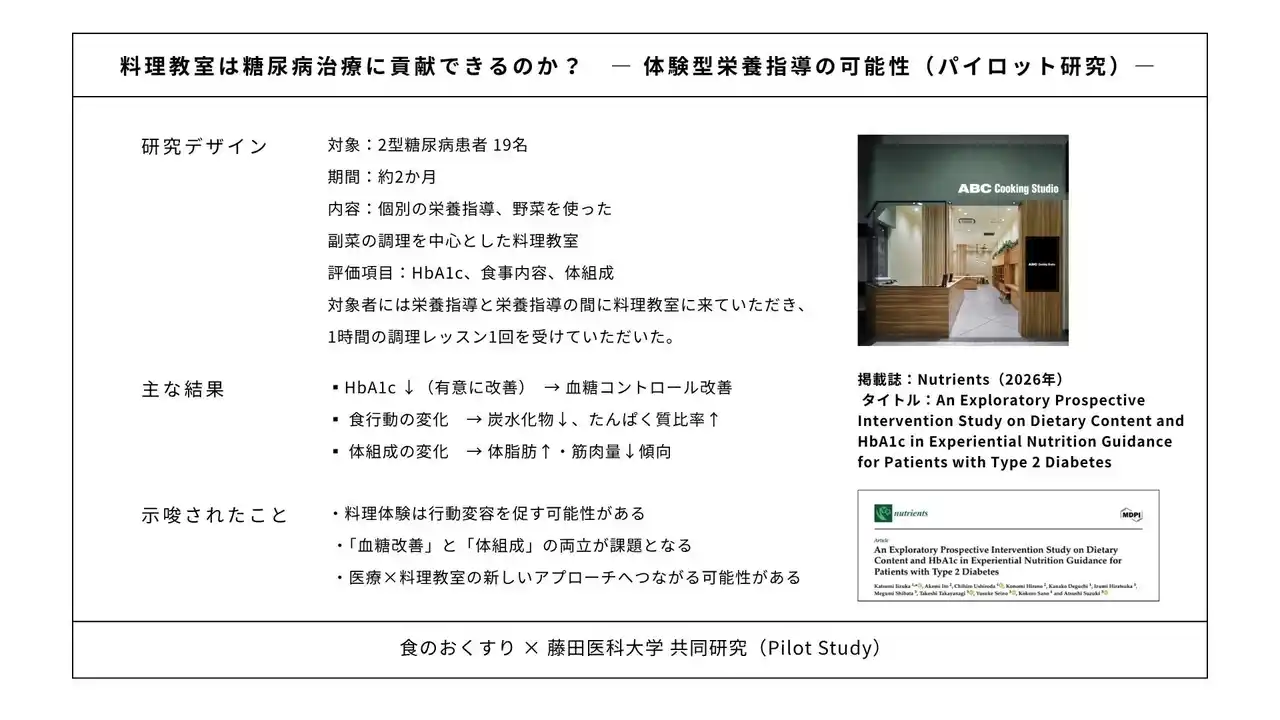 株式会社食のおくすり(代表取締役:佐野こころ、以下「当社」)は、藤田医科大学と共同で、「料理教室を取り入れた体験型栄養指導」が2型糖尿病患者に与える影響を検証する研究を実施しました。 |