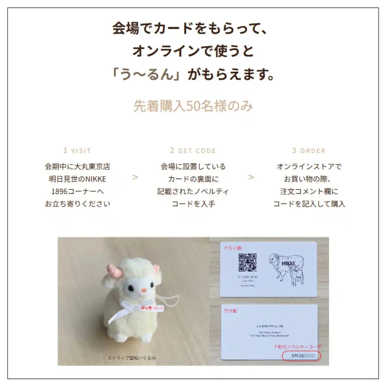 オンライン購入の際に7桁のノベルティコードをコメント欄に記載いただくと、商品と一緒にストラップ型う~るんをお送りいたします。 |