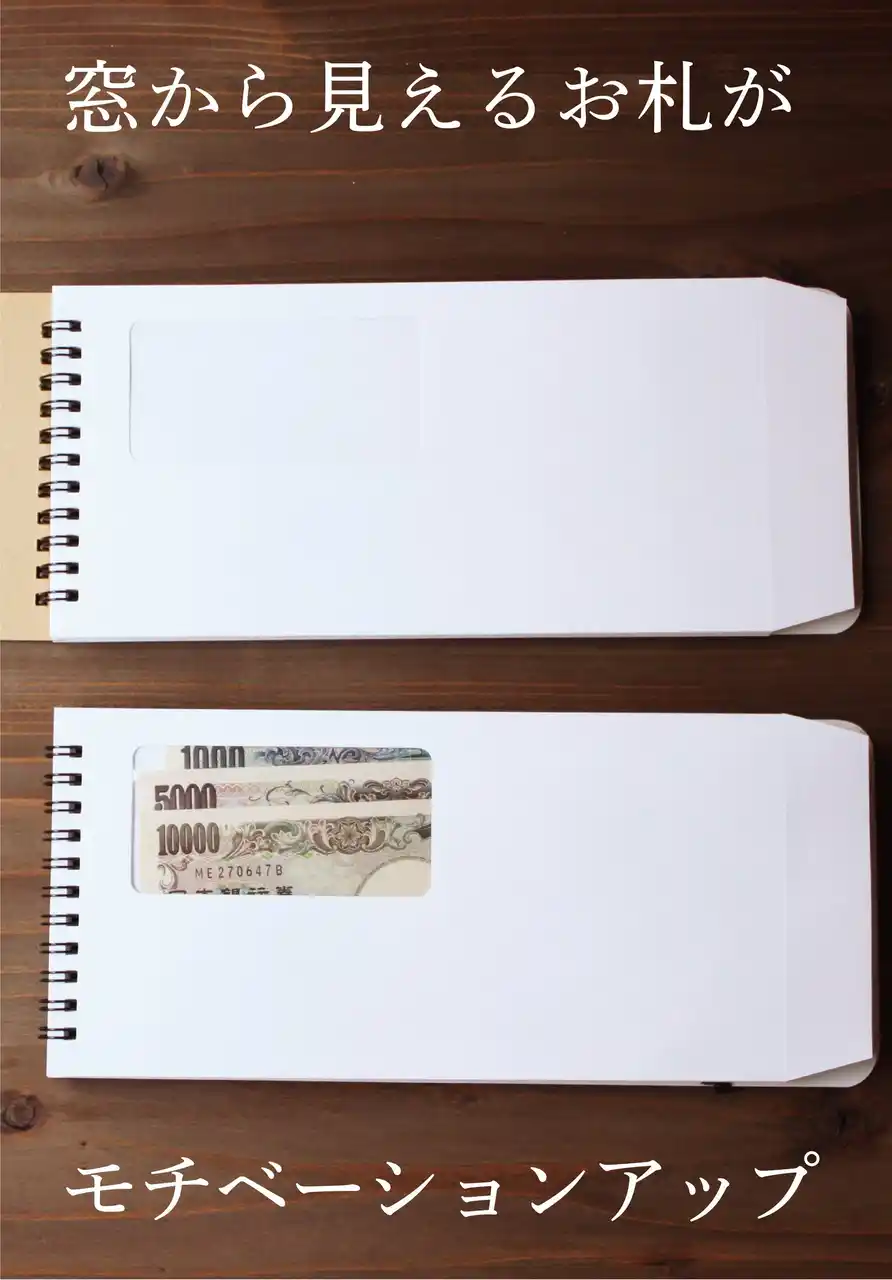窓付き封筒からは封筒に入ったお金が可視化され、貯まっている実感とともにモチベーションが維持されます。 |
