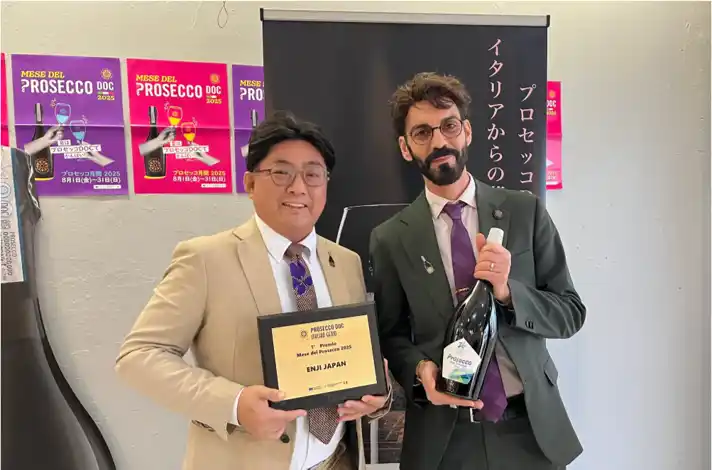 2025年プロセッココンクール総合優勝時の表彰式の様子 左:ENJIJAPAN(株式会社ENJI)安居亮治 右:イタリア大使館職員 |