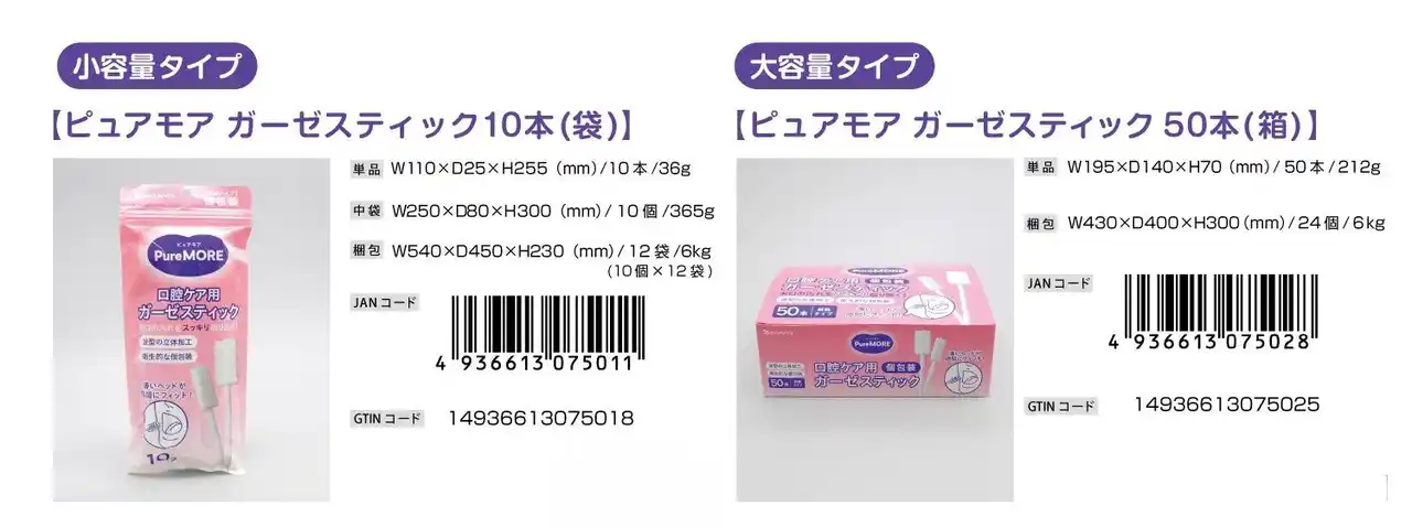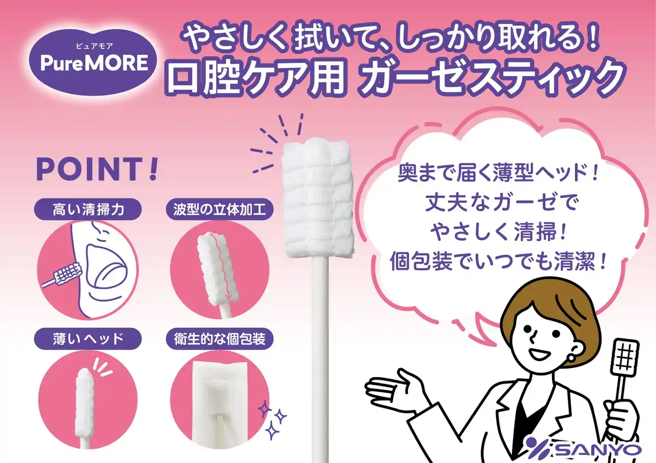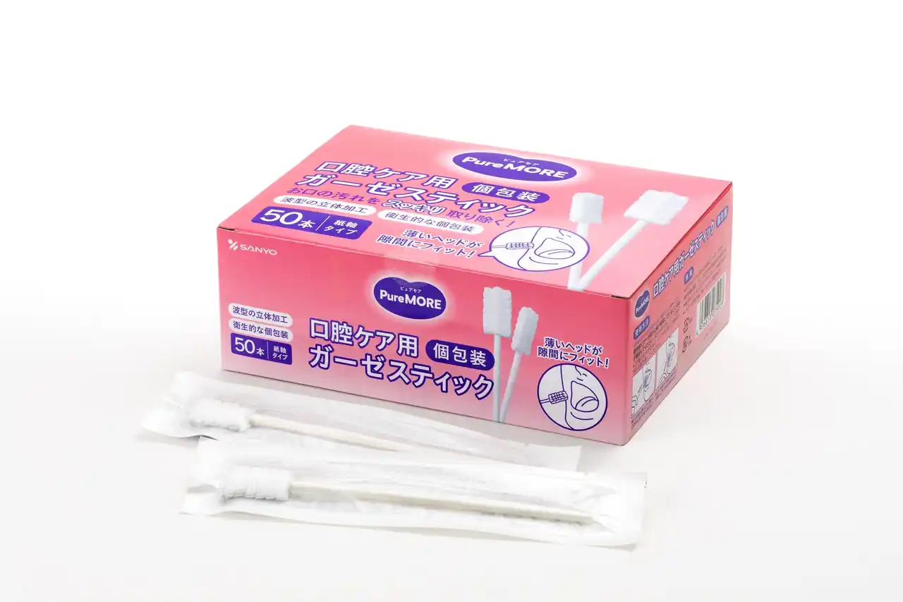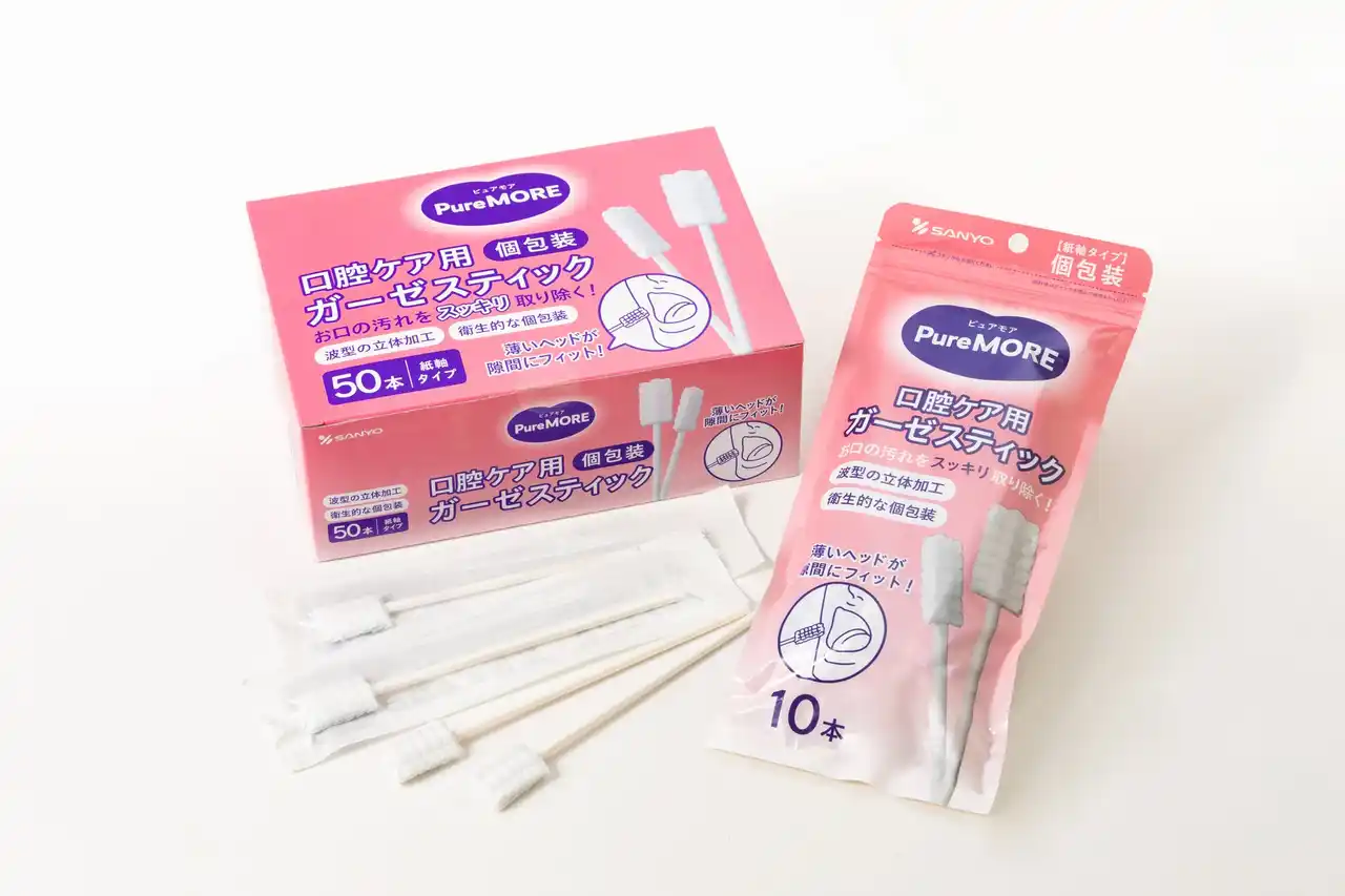 綿棒一筋、創業59年目の綿棒メーカー株式会社山洋(本社:大阪府富田林市、代表取締役社長:日比 努)は、急激な高齢化社会に伴う口腔ケア需要の増大を受け、介護・衛生現場の負担を軽減するため、ガーゼ素材のメリットを最大限活かした介護補助用綿棒の新しいアイテムとして新商品ブランド「ピュアモア 口腔ケア ガーゼスティック」シリーズ2種(袋入り10本/箱入り50本)を発売致しました。 |