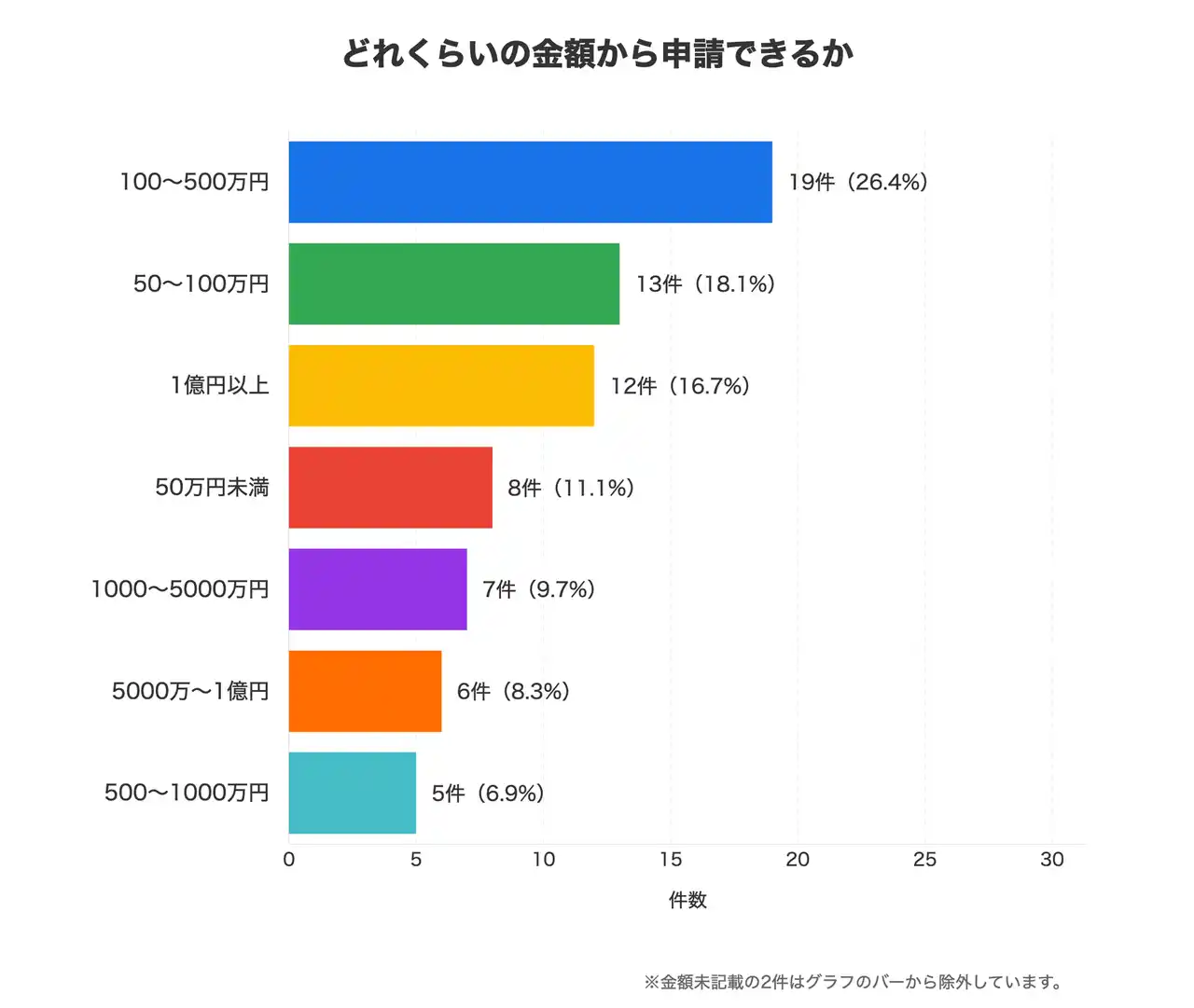 | 100~500万円の金額帯が中心を占める一方、1億円以上の大型支援も一定数確認されており、投資規模に応じた制度が揃っています。 | ||||||||||||||