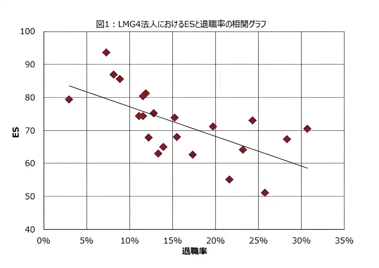| 株式会社リンクアンドモチベーションの『「エンゲージメントと退職率の関係」に関する研究結果』によると、ES(エンゲージメントスコア)と退職率の間には負の相関が見られ、エンゲージメントが高い組織ほど退職率が低い傾向が示されています。 | |||||||||||
