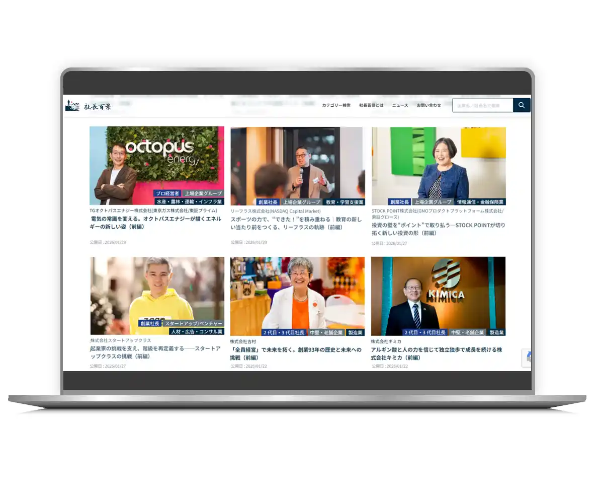 | 「社長百景」は、経営者へのインタビューを通じて、経営者の哲学や事業への想いを言語化し、物語として発信する経営者インタビューメディアです。 | |||||||||||