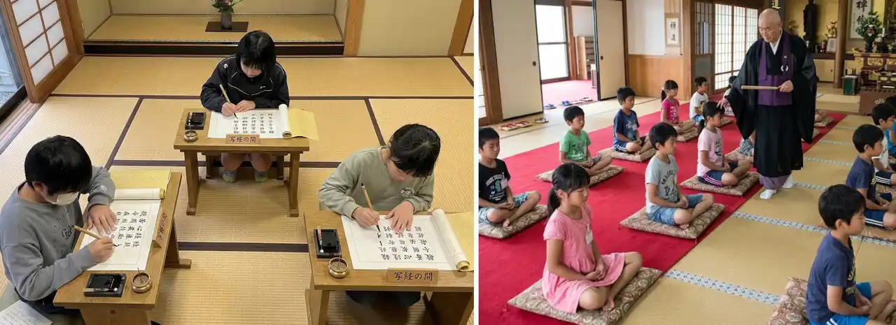 坐禅体験では、住職の案内のもと親子で並んで静かに呼吸を整え、お寺ならではの凛とした空気を全身で感じていただきます。写経体験では、親子で筆を持ち一文字一文字を丁寧になぞる、日常ではなかなか味わえない集中のひとときです(お子さま向けのなぞり書き簡易版もご用意します)。 |