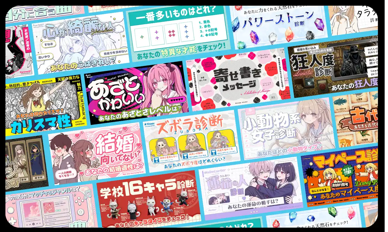 本サービスを掲載している「Makko診断ポータル」は、恋愛・性格・心理テスト・美容・クイズ・占いなど、多彩な診断コンテンツを楽しめる診断専門のポータルサイトです。 |