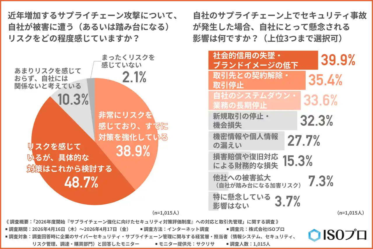 株式会社ISOプロ(本社:東京都新宿区、代表取締役:米田 泰三)は、企業のサイバーセキュリティ・サプライチェーン管理に関与する経営層・担当者を対象に、「2026年度開始『サプライチェーン強化に向けたセキュリティ対策評価制度』への対応と取引先管理」に関する調査を行いました。