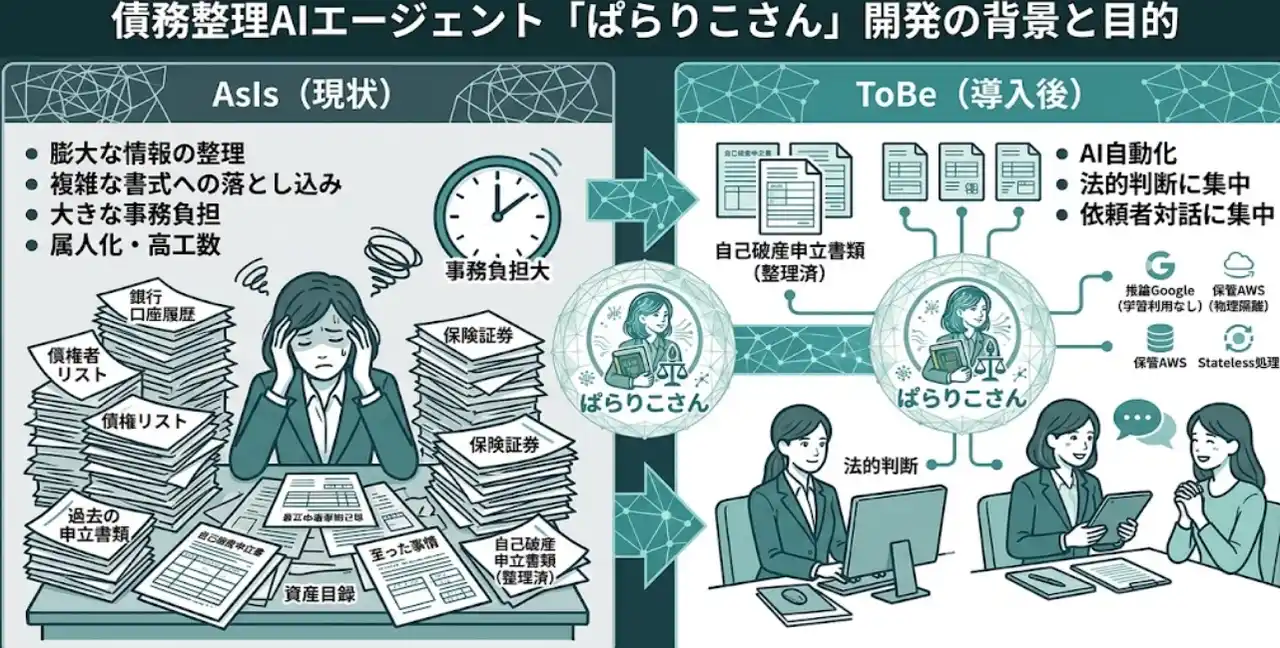 | 「ぱらりこさん」は、この属人化しやすく工数のかかる業務をAIによって自動化し、弁護士が本来注力すべき法的判断や依頼者への対話に集中できる環境を構築するために開発されました。 | |||