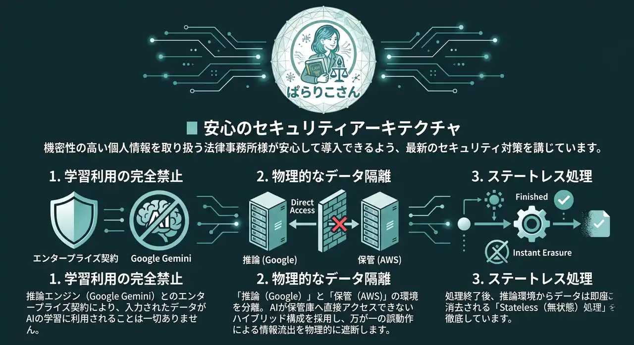 | 学習利用の完全禁止:推論エンジン(Google Gemini)とのエンタープライズ契約により、入力されたデータがAIの学習に利用されることは一切ありません。 | |||