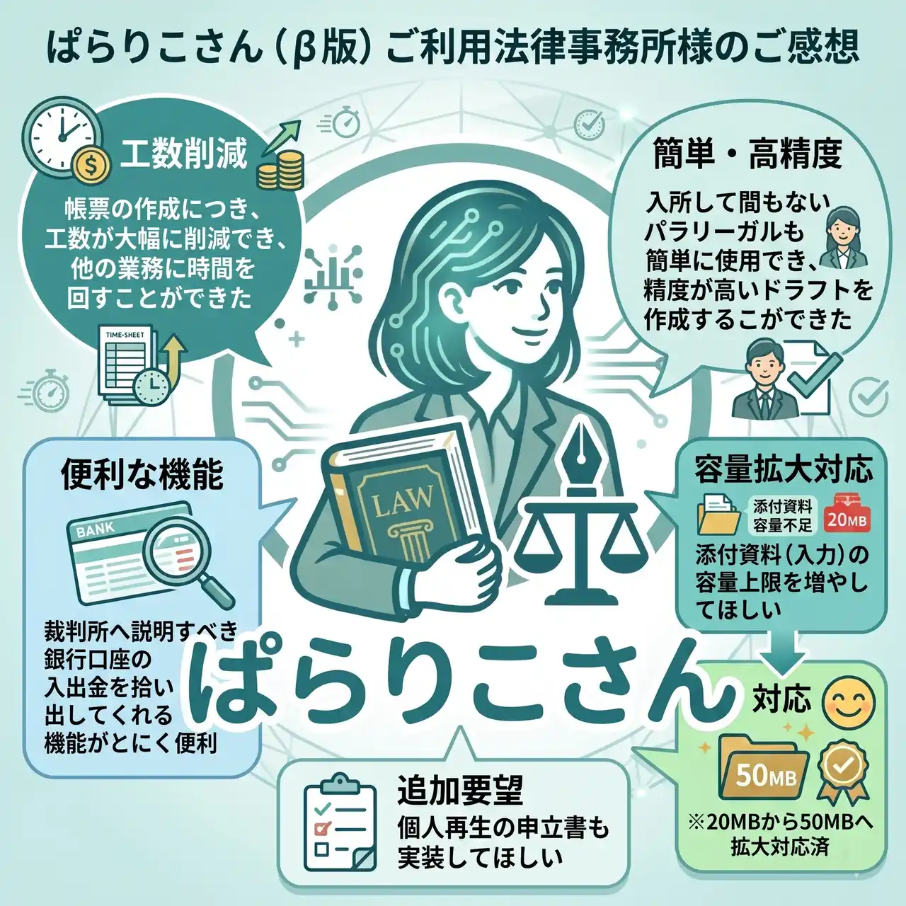 | 『ぱらりこさん』は、先生方の業務負担を劇的に軽減し、弁護士が本来注力すべき法的判断や依頼者様との対話に集中できる環境を提供します。 | |||