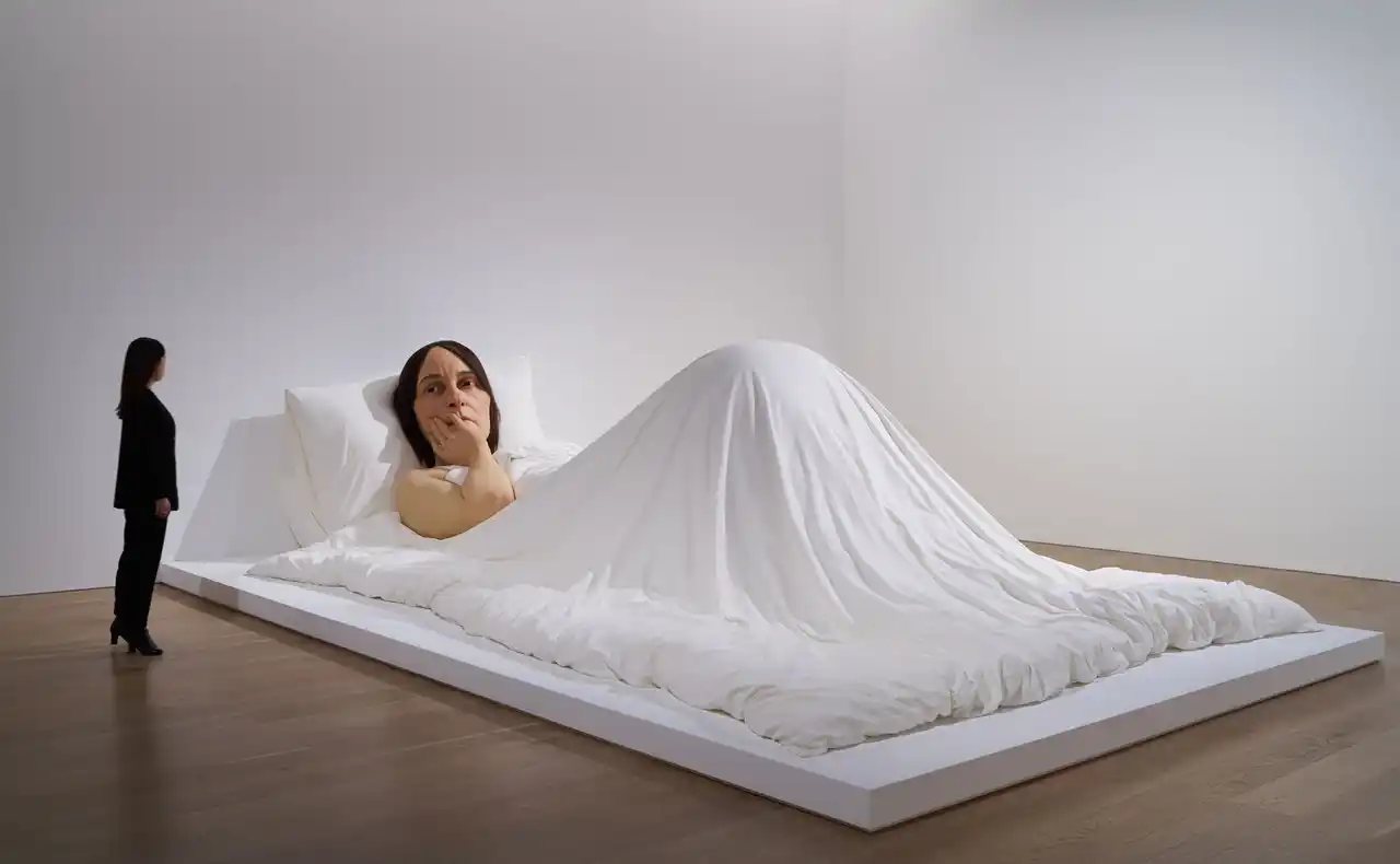 ロン・ミュエク《イン・ベッド》2005年 | 所蔵:カルティエ現代美術財団 | 展示風景:「ロン・ミュエク」森美術館(東京)2026年 | 撮影:吉村昌也 | 画像提供:カルティエ現代美術財団 |