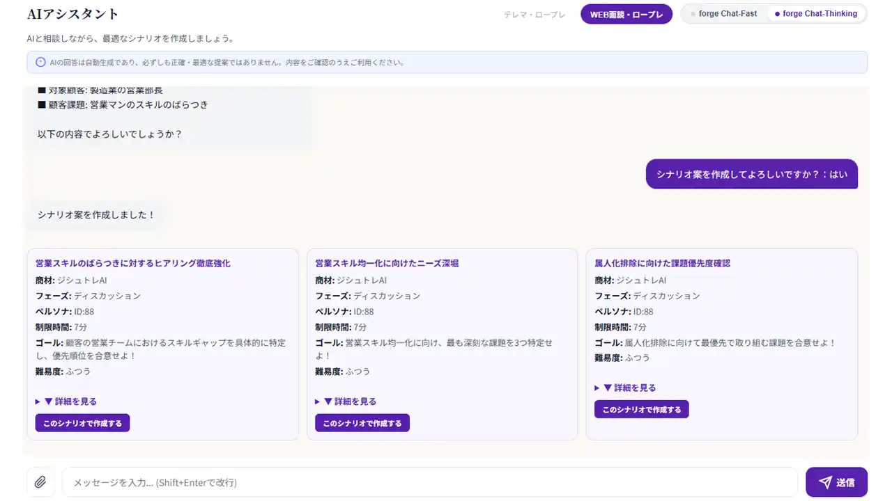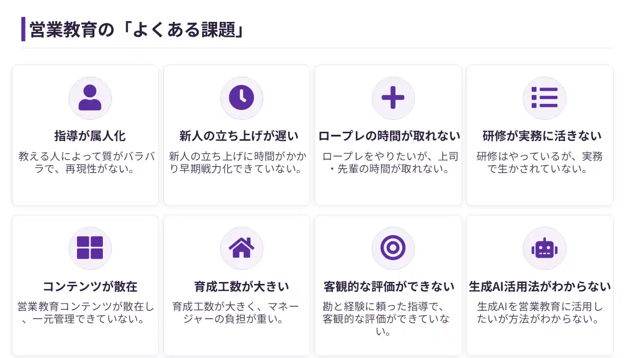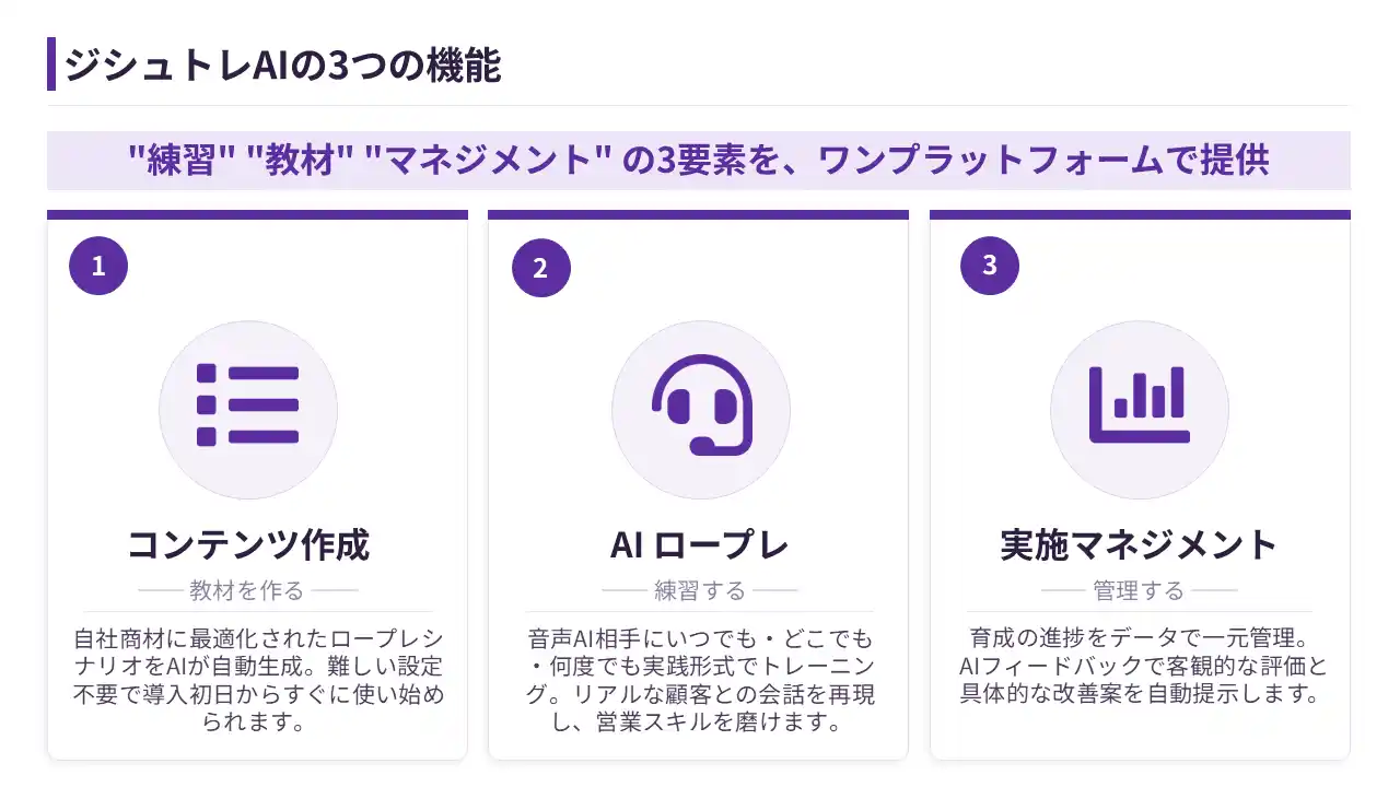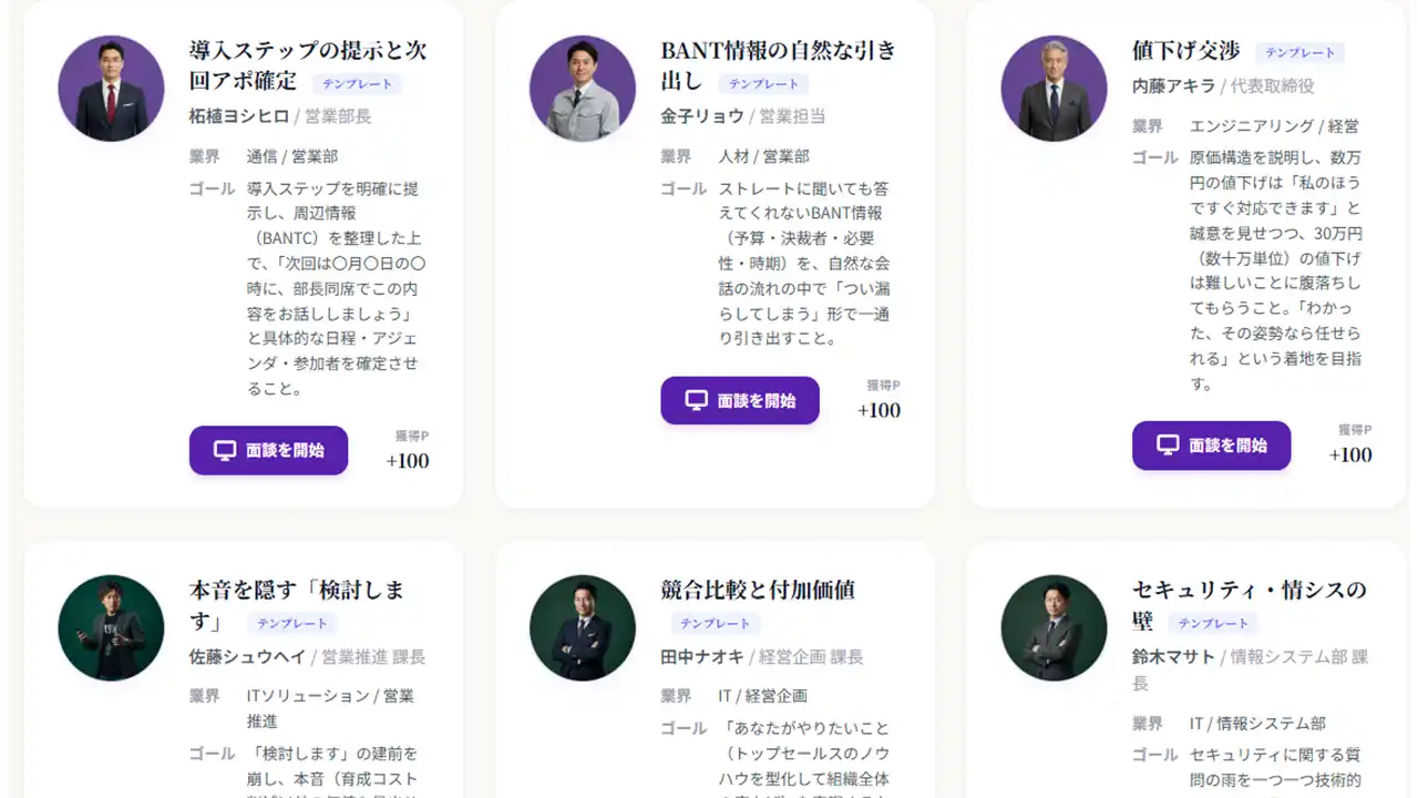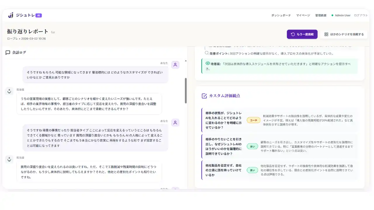 「ジシュトレAI」は、営業担当者の商談力向上と早期戦力化を目的とした、AI活用型の営業ロールプレイングサービスです。実際の商談を想定したシナリオのもと、AIが顧客役となって対話を行い、ヒアリング力、提案力、課題整理力、クロージング力など営業活動に必要な実践スキルを繰り返しトレーニングできます。実施後は会話内容を分析し、話し方や質問内容、提案の精度などを可視化しながら具体的な改善点をフィードバック。指導者ごとの差が出やすい従来のOJTに比べ、均一で再現性の高い育成環境を実現します。新人営業の立ち上がり支援はもちろん、中堅層のスキル強化や管理職の指導負担軽減にも対応し、企業全体の営業生産性向上に貢献するサービスです。 |