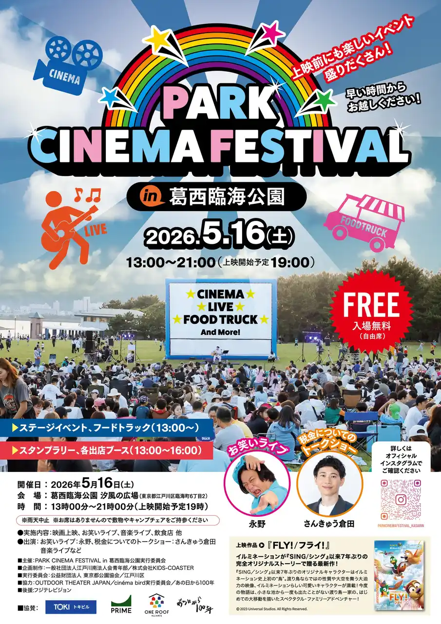 | 「日本全国どこでも劇場化」をコンセプトに野外映画イベントを通して地方の活性化を行って来たOUTDOOR THEATER JAPAN(株式会社バックヤード、株式会社ラコル)は2026年5月16日(土)、東京・葛西臨海公園 汐風の広場にて開催される「PARK CINEMA FESTIVAL in 葛西臨海公園」に協力いたします。 | |||||||||||||||||||||