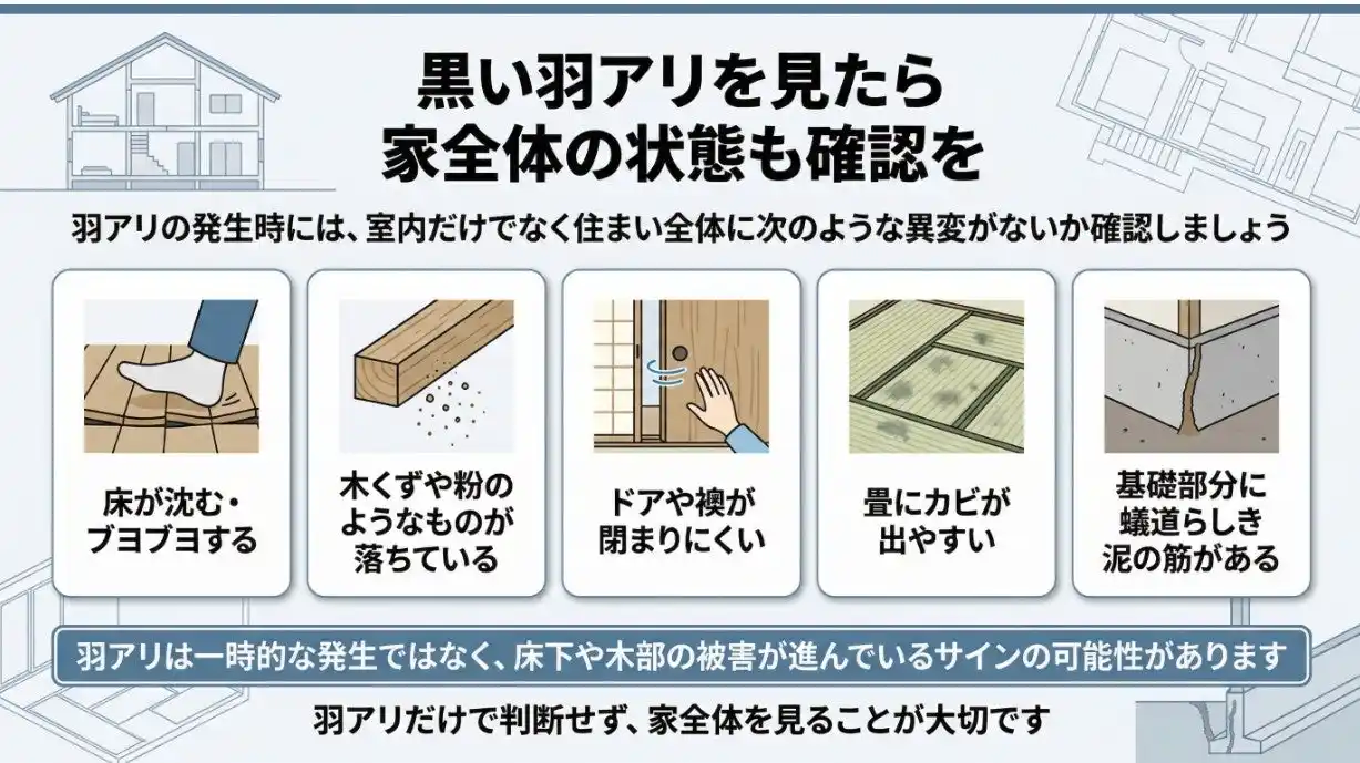 | 放置すると、木材の食害、床の沈み、建具の不具合、水廻り付近の劣化など、住まいの快適性や耐久性に関わる問題につながるおそれがあります。「羽アリが出たかどうか」ではなく、「なぜ出たのか」まで確認することが重要です。 | ||||||||