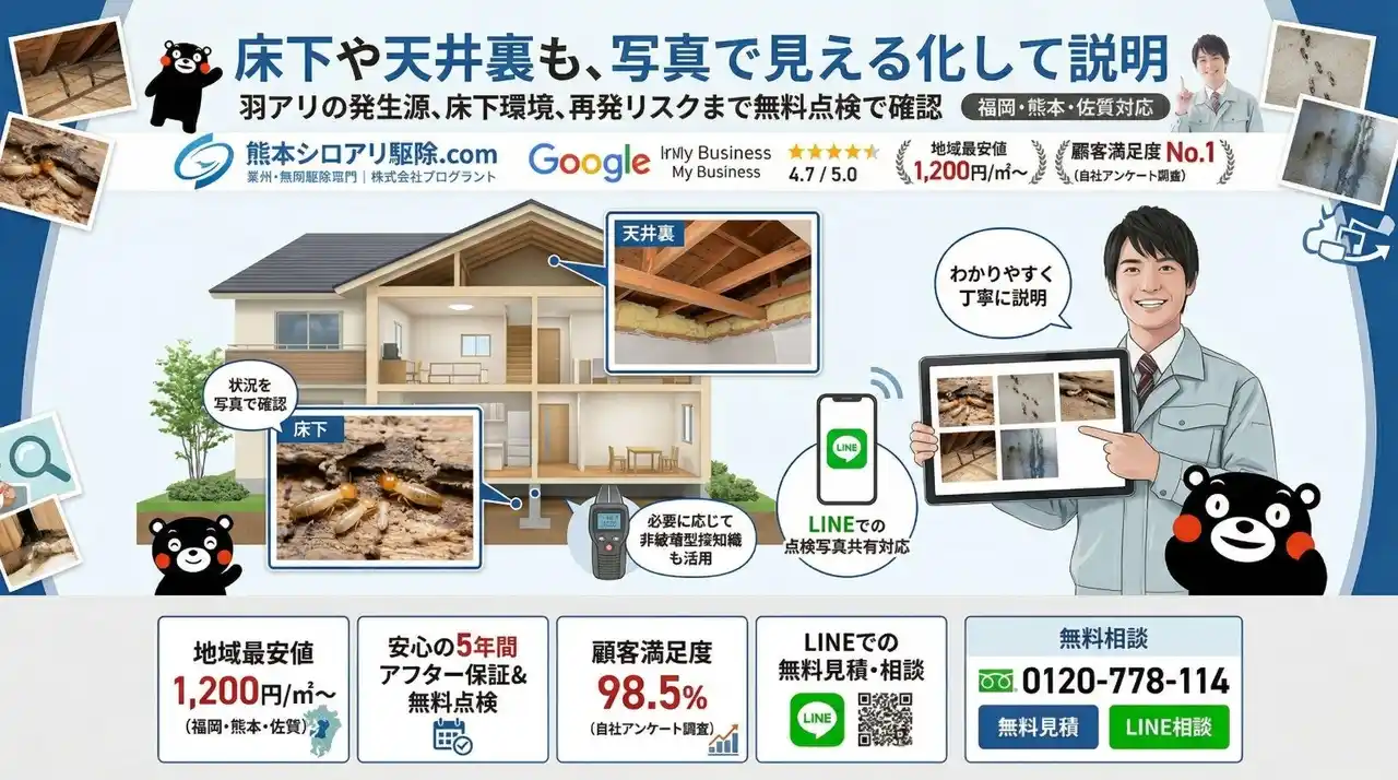 | プログラントでは、福岡県・熊本県・佐賀県を対象に、シロアリ被害の有無だけでなく、羽アリの発生源、床下環境、再発リスクまで含めた無料点検を行っています。家の中で黒い羽アリを見た方に対しても、その場の駆除だけで終わらせず、「本当に床下でシロアリが活動していないか」「放置しても大丈夫な状態か」まで確認することを重視しています。 | ||||||||